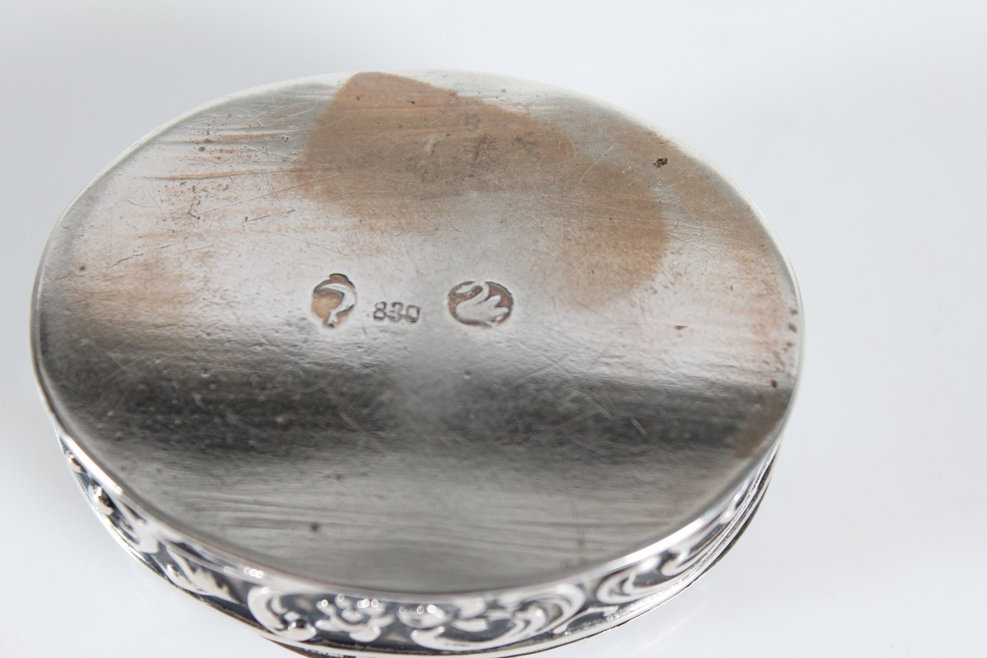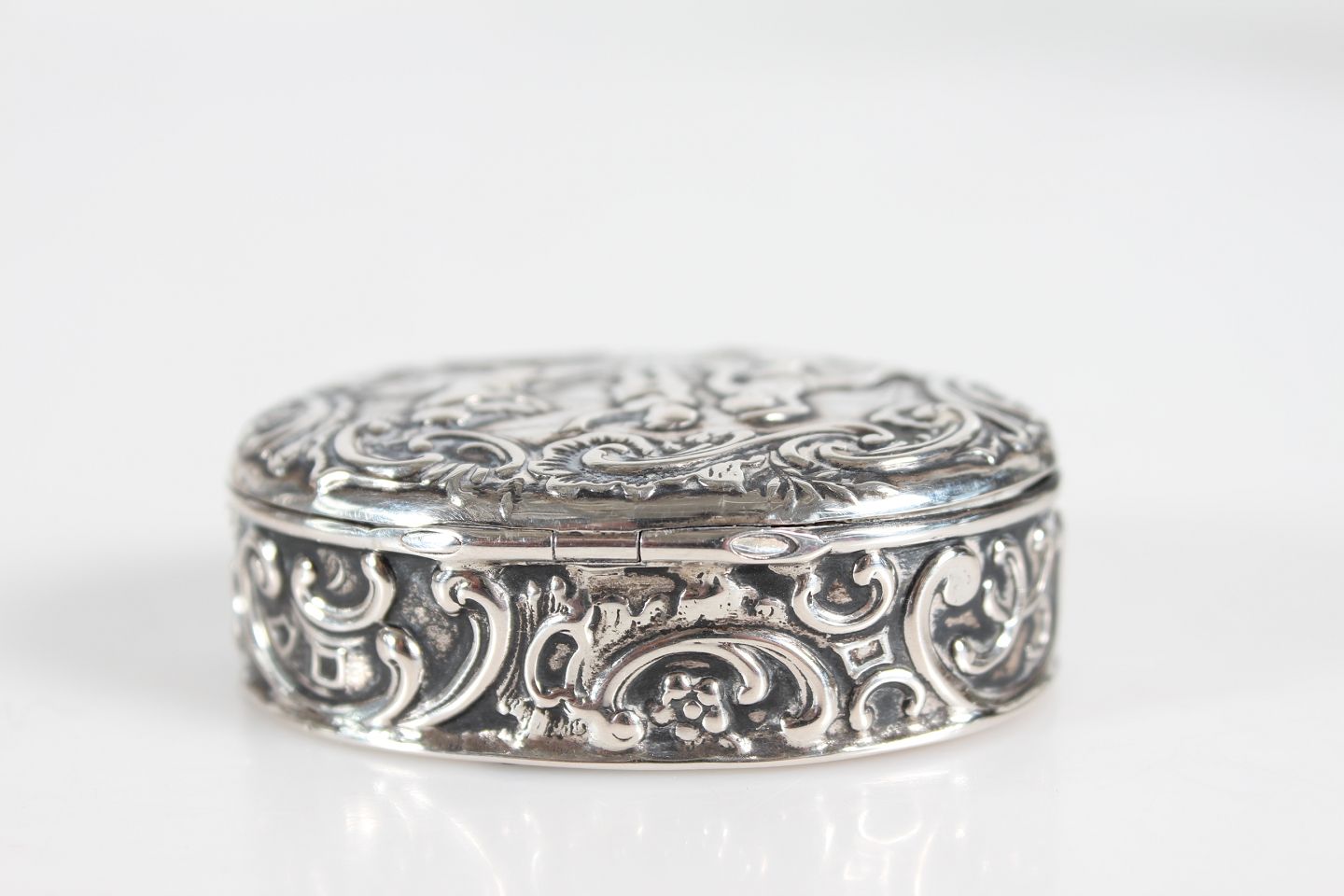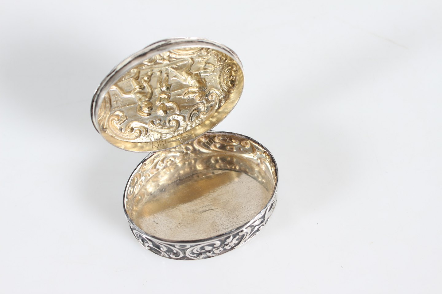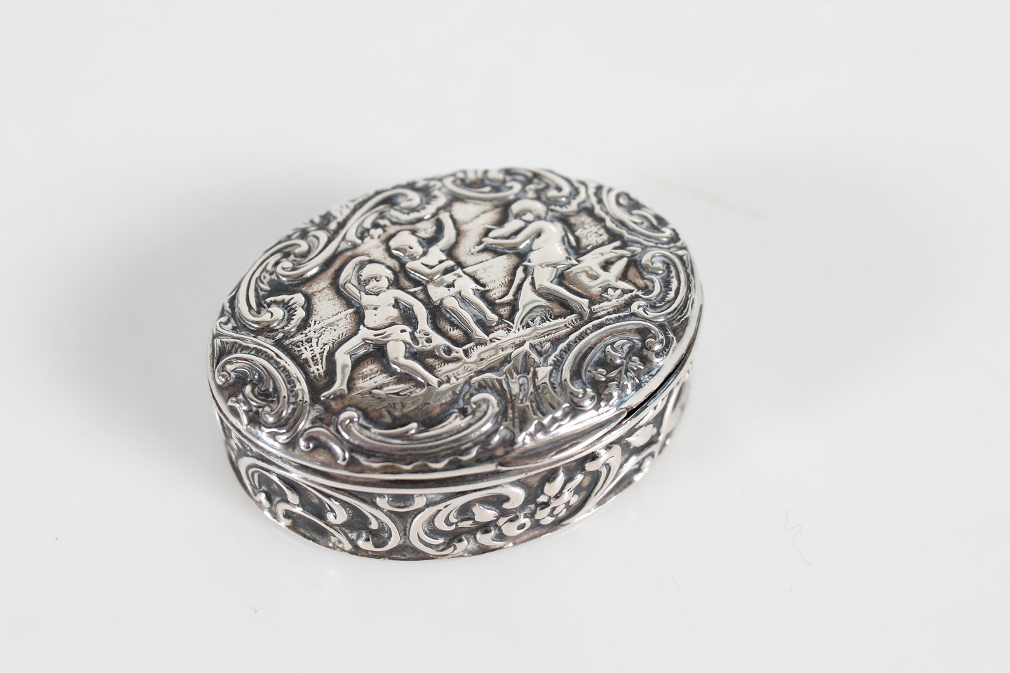 Dansk Sølvsmed Oval pilleæske fremstillet af sølv 830 med motiv af lystigt dansende personer Længde 5,5 cm Bredde 4 cm Fin antik stand