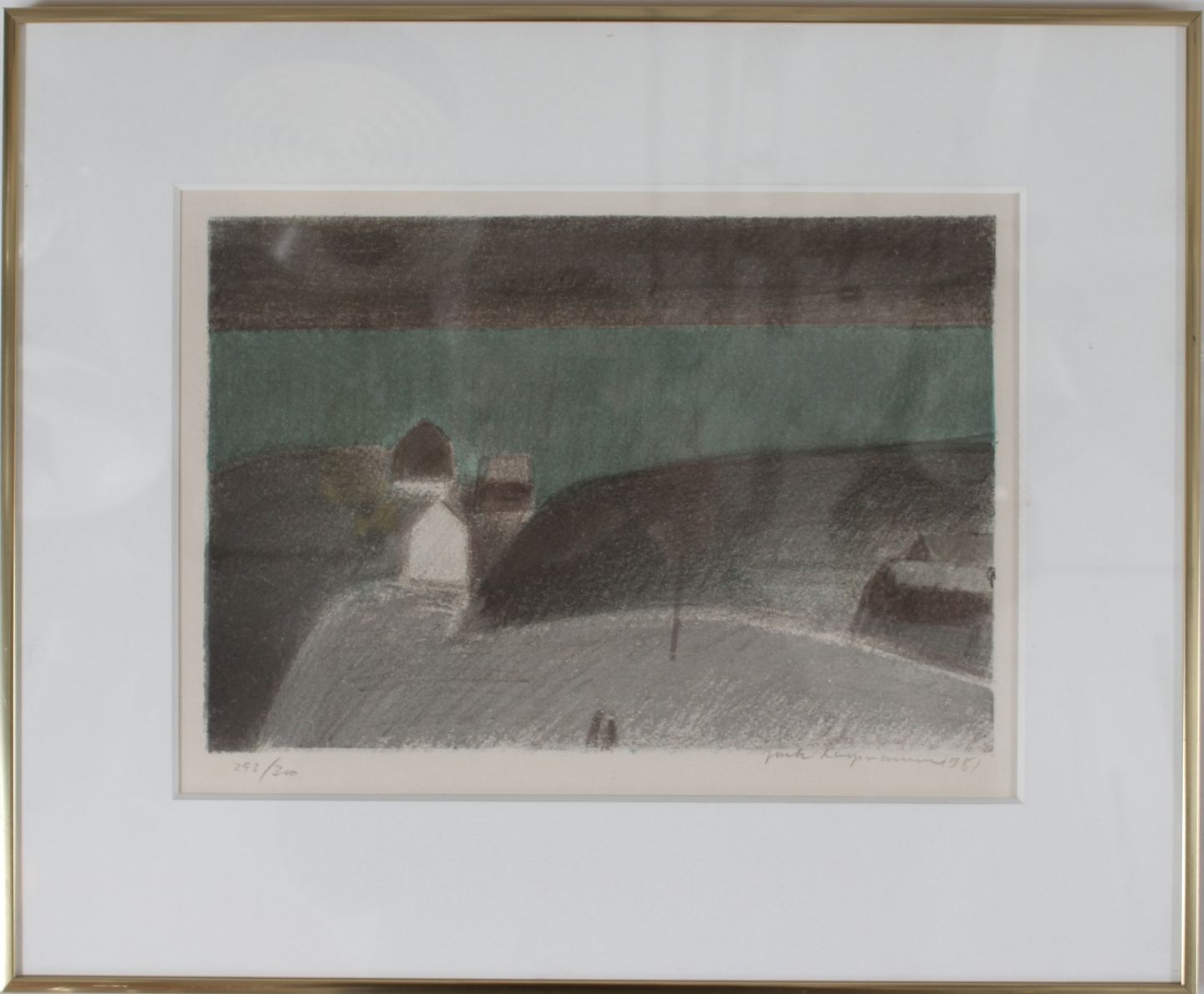 Jack Kampmann (1914-89) Lithography in colors with motif from the Faroe Islands in golden wood frame 293/300 Sign. Jack Kampmann 1981 Size incl. frame 44.5 cm x 52 cm Very nice condition