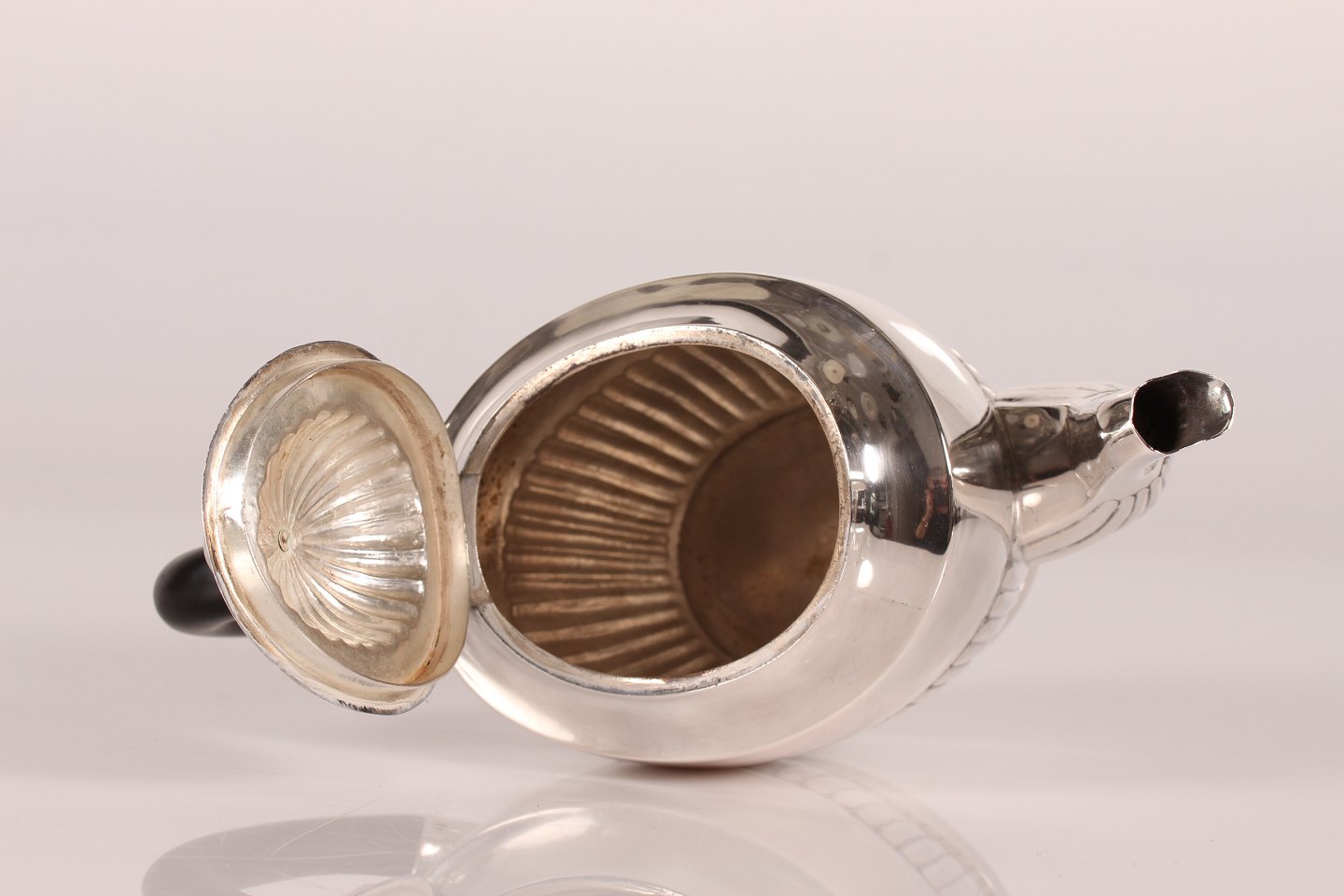 August Thomsen Thepotte i Empirestil af ægte 3 tårnet sølv med håndtag af ibenholt Fremstillet af sølvsmed Aug. Thomsen i 1918 med 3 tårnet stempel Højde 13 cm Længde 22 cm Fin stand - se nærbillede af limet hank