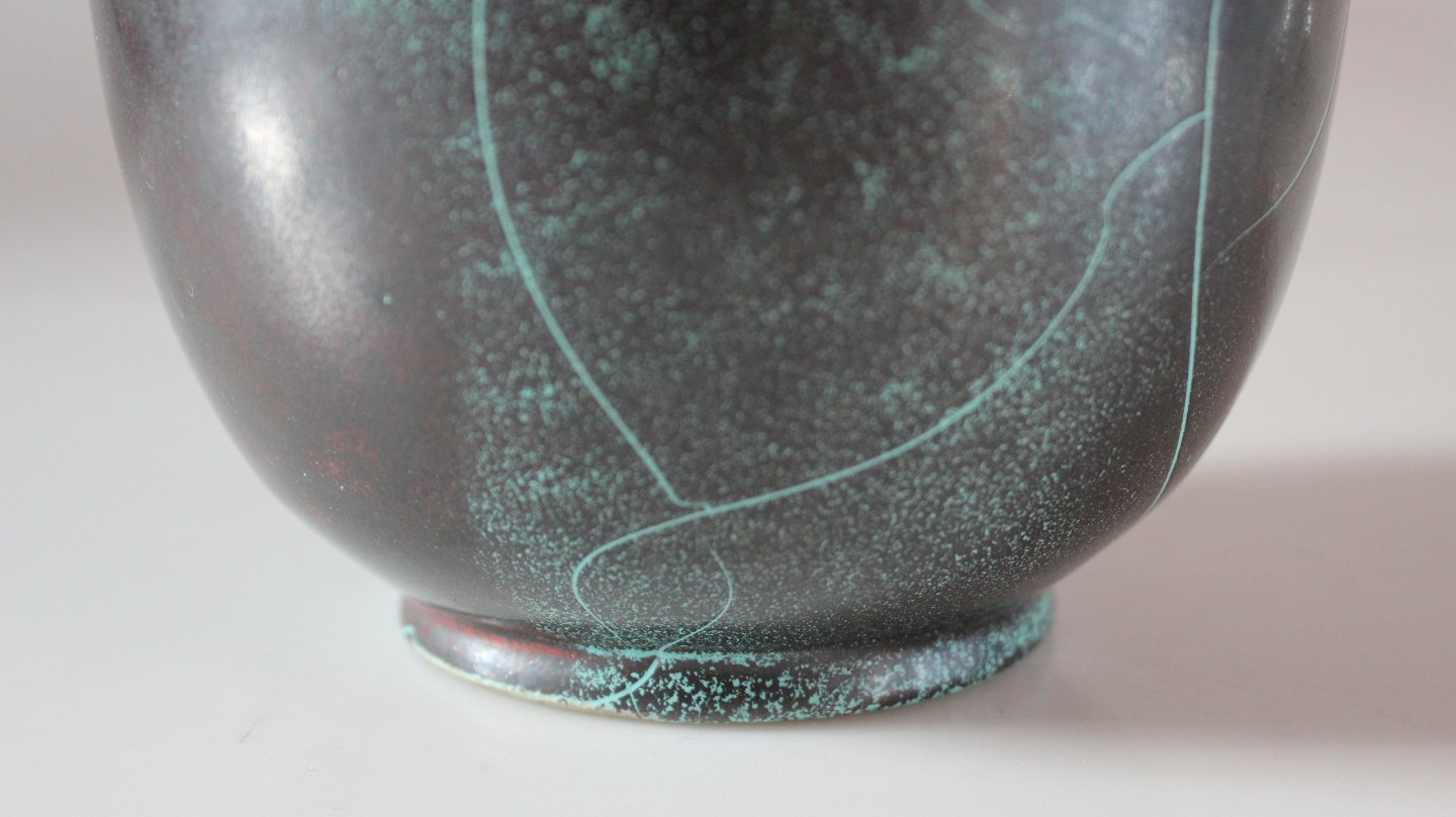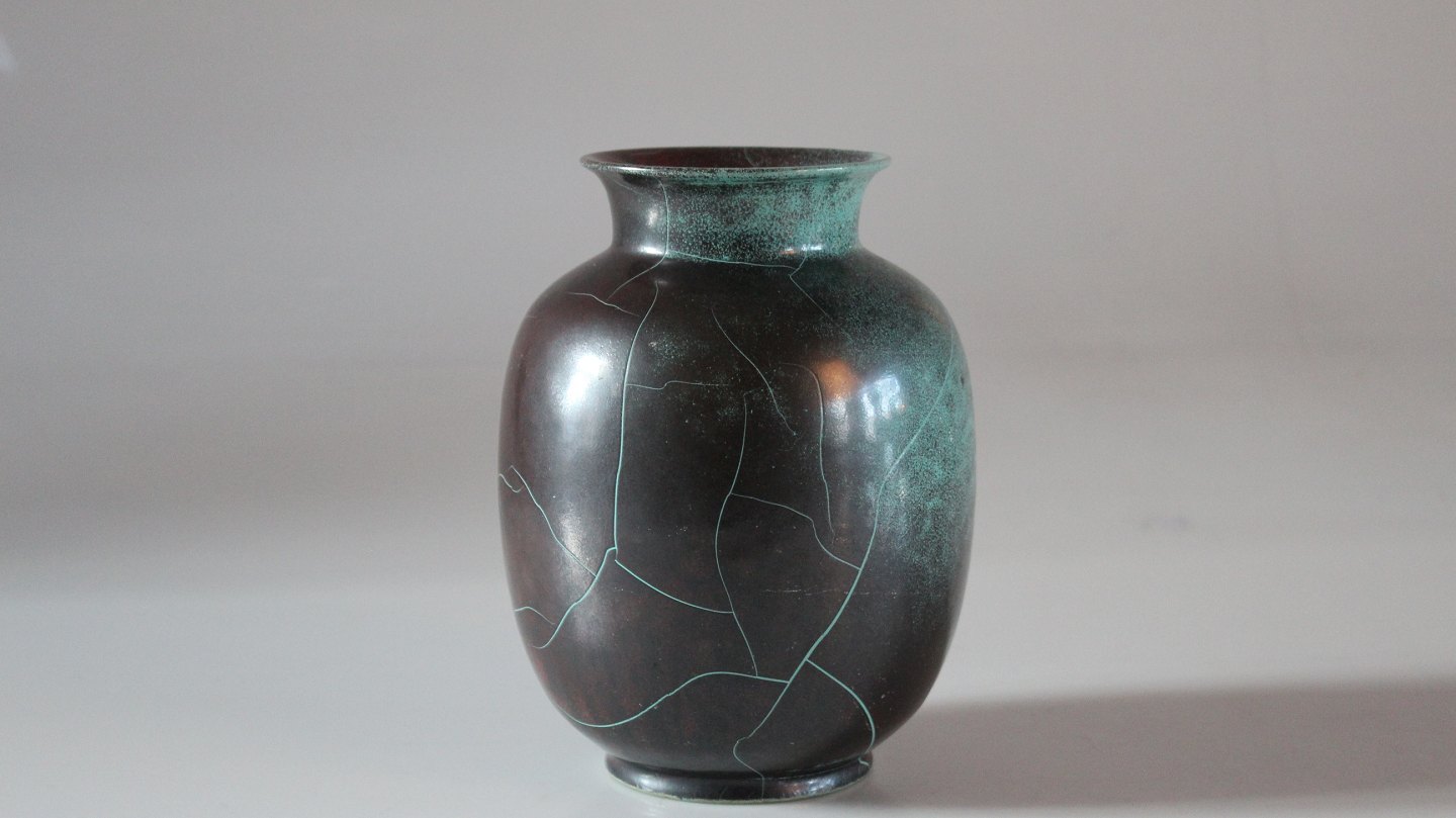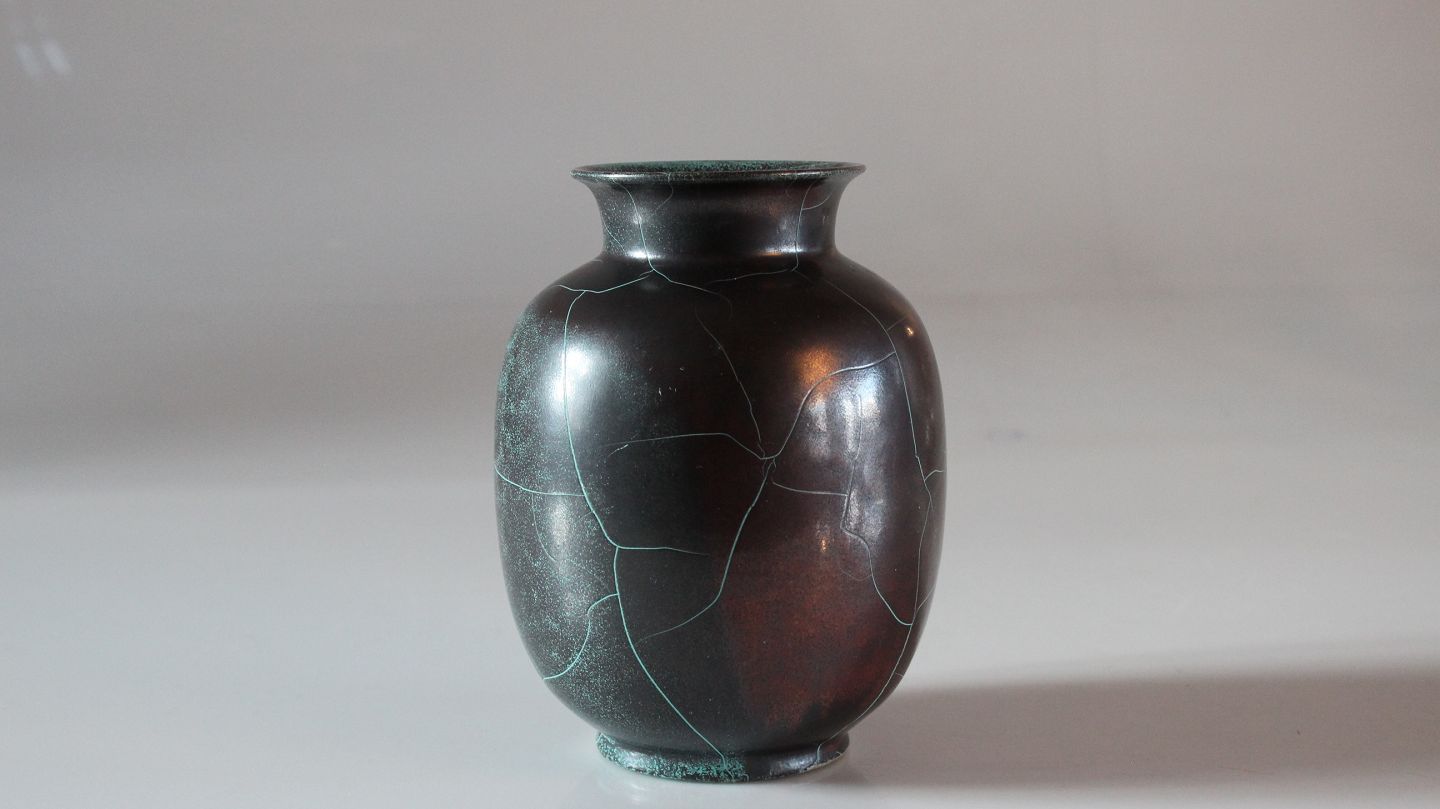 Richard Uhlemeyer (1900-1954) Keramik vase dekoreret med danit-glasur i rødbrune og turkise nuancer og krakele struktur Diameter 15 cm Højde 20,5 cm Fin stand uden skår eller reparation