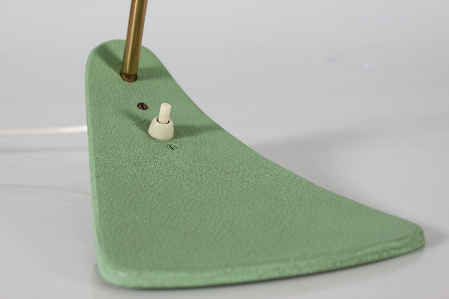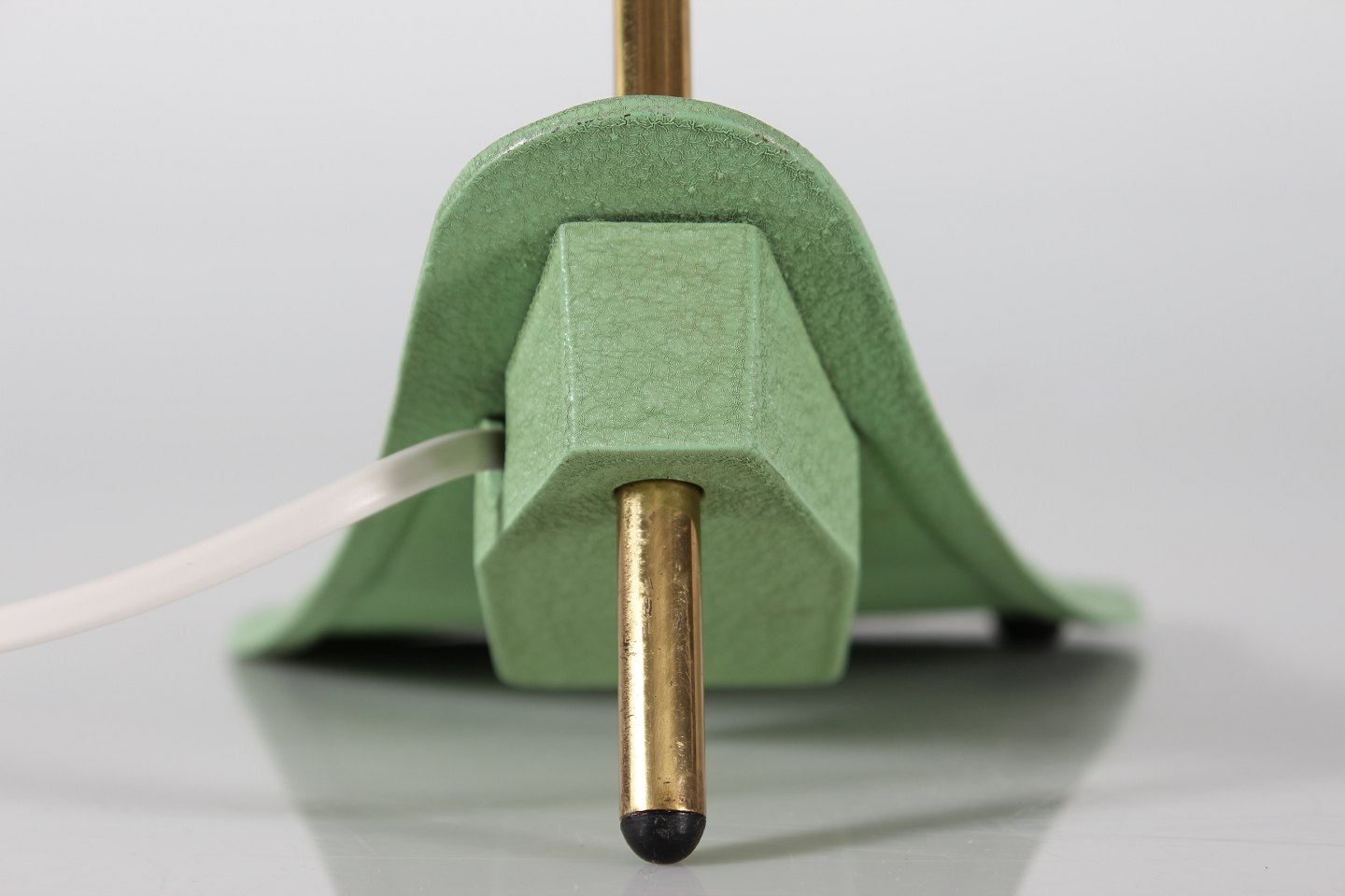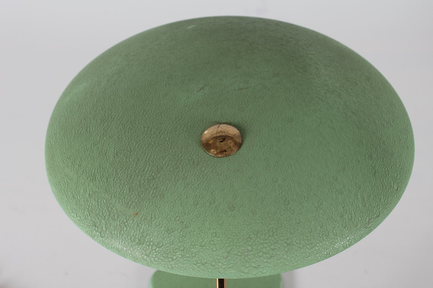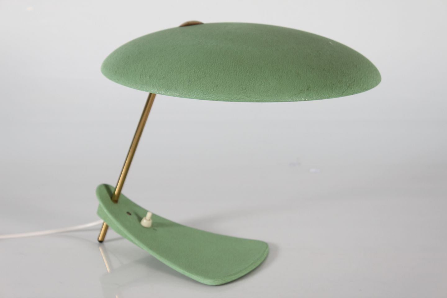 Italiensk bordlampe UFO Fremstillet i metal og messing med støvet grøn lak Tilskrevet den Italienske producent Stilnovo Højde 32 cm Længde 40 cm Diameter skærm 35 cm Fin funktionsdygtig stand