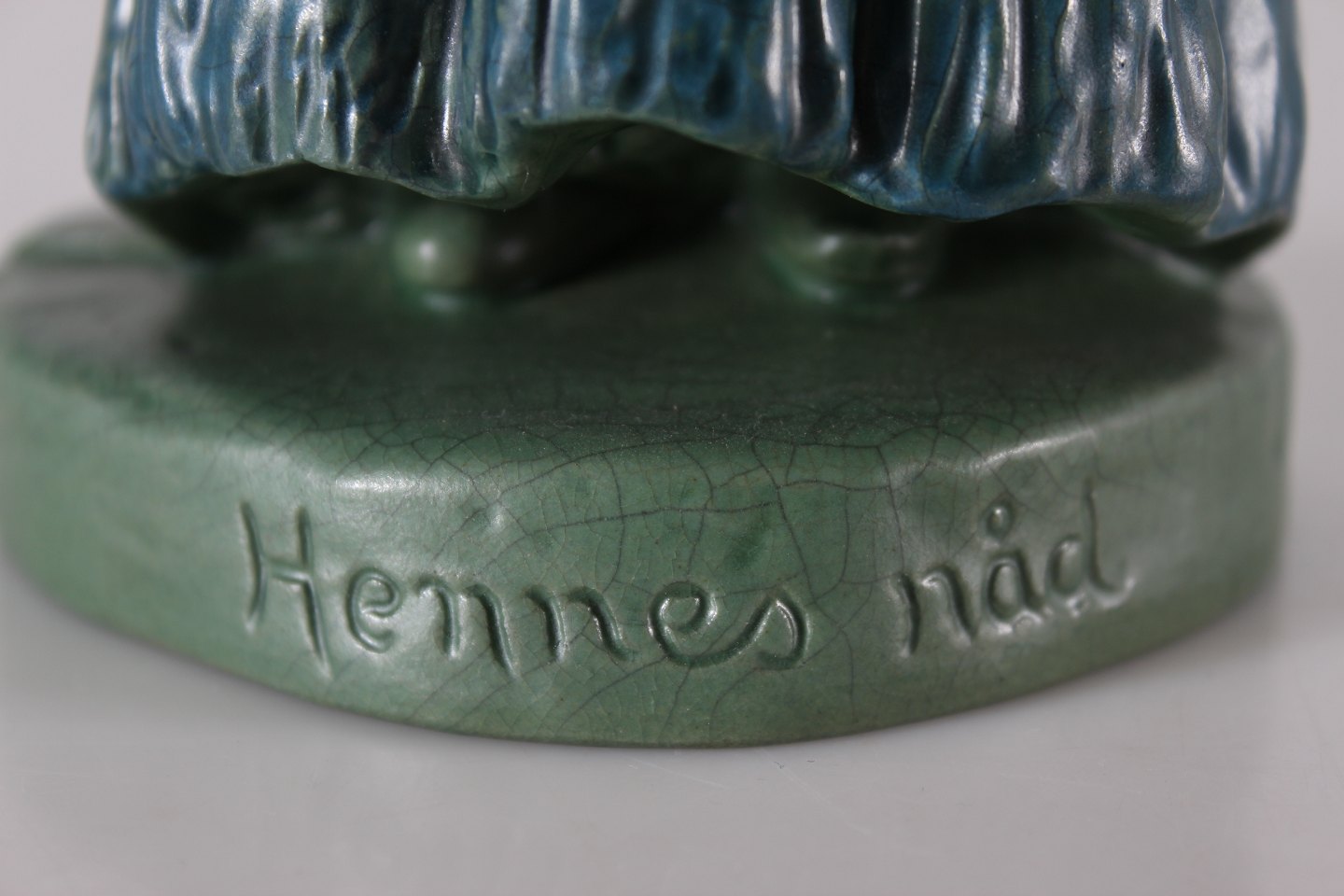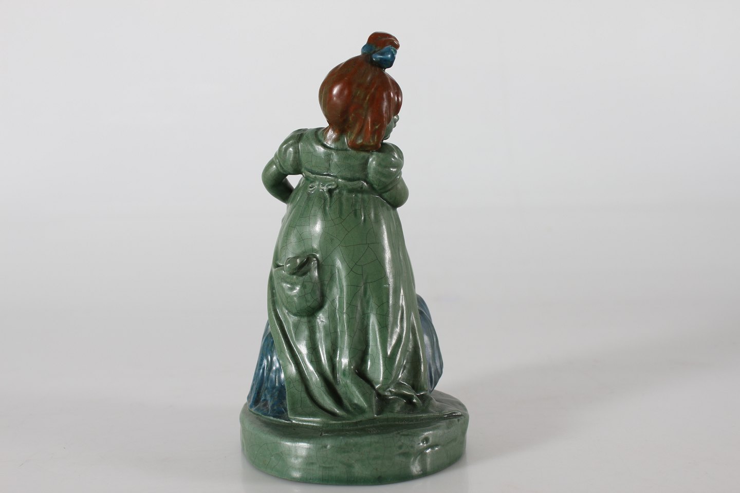 Ipsens Enke Figur "Hennes nåd" nr. 891 formgjort af Lena Börjeson (1879-1976) Fremstillet af keramik dekoreret med jadegrøn glasur samt lidt rødt og blåt Højde 18,5 cm Fin stand med enkelt chip på sløjfen