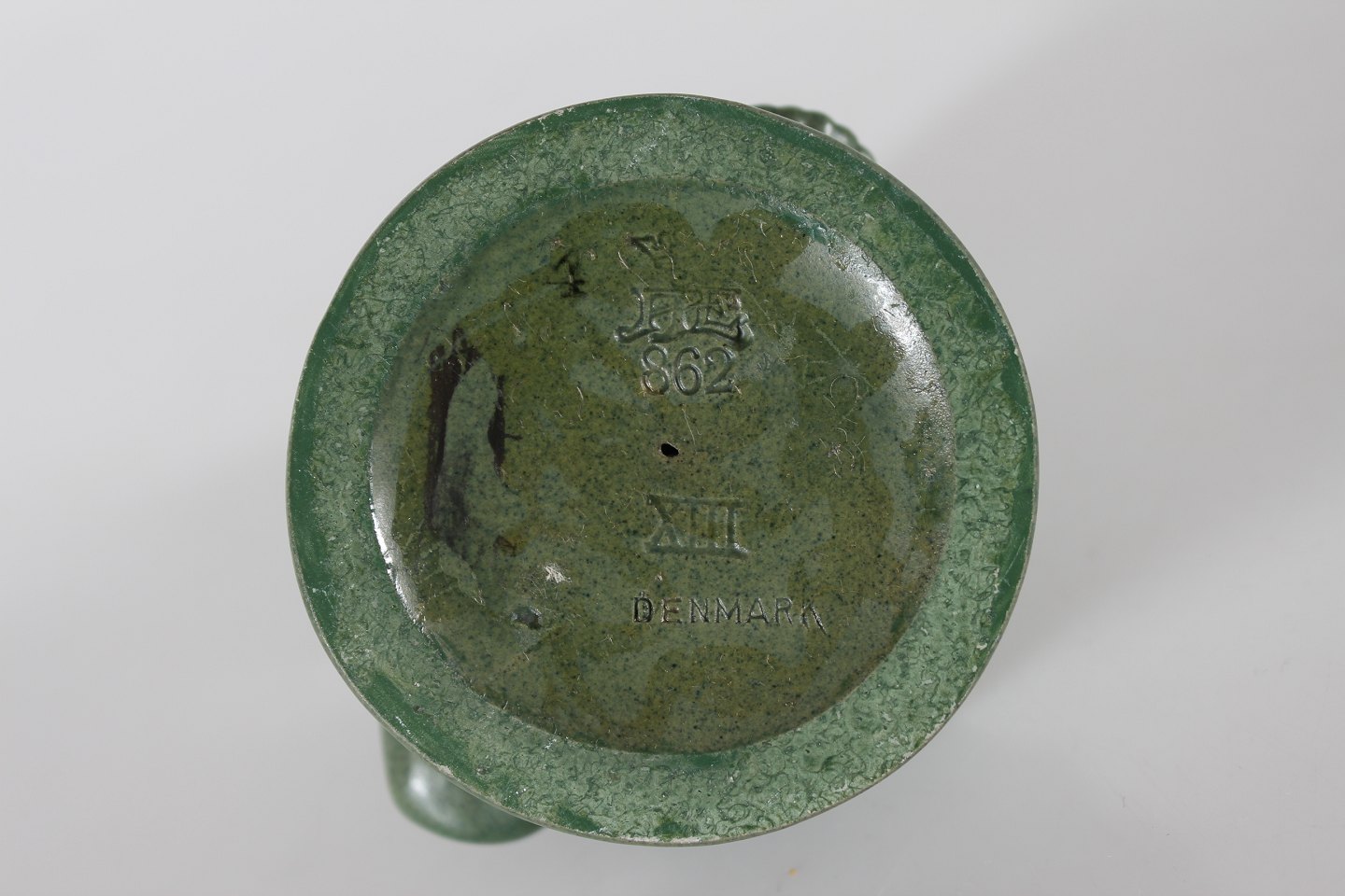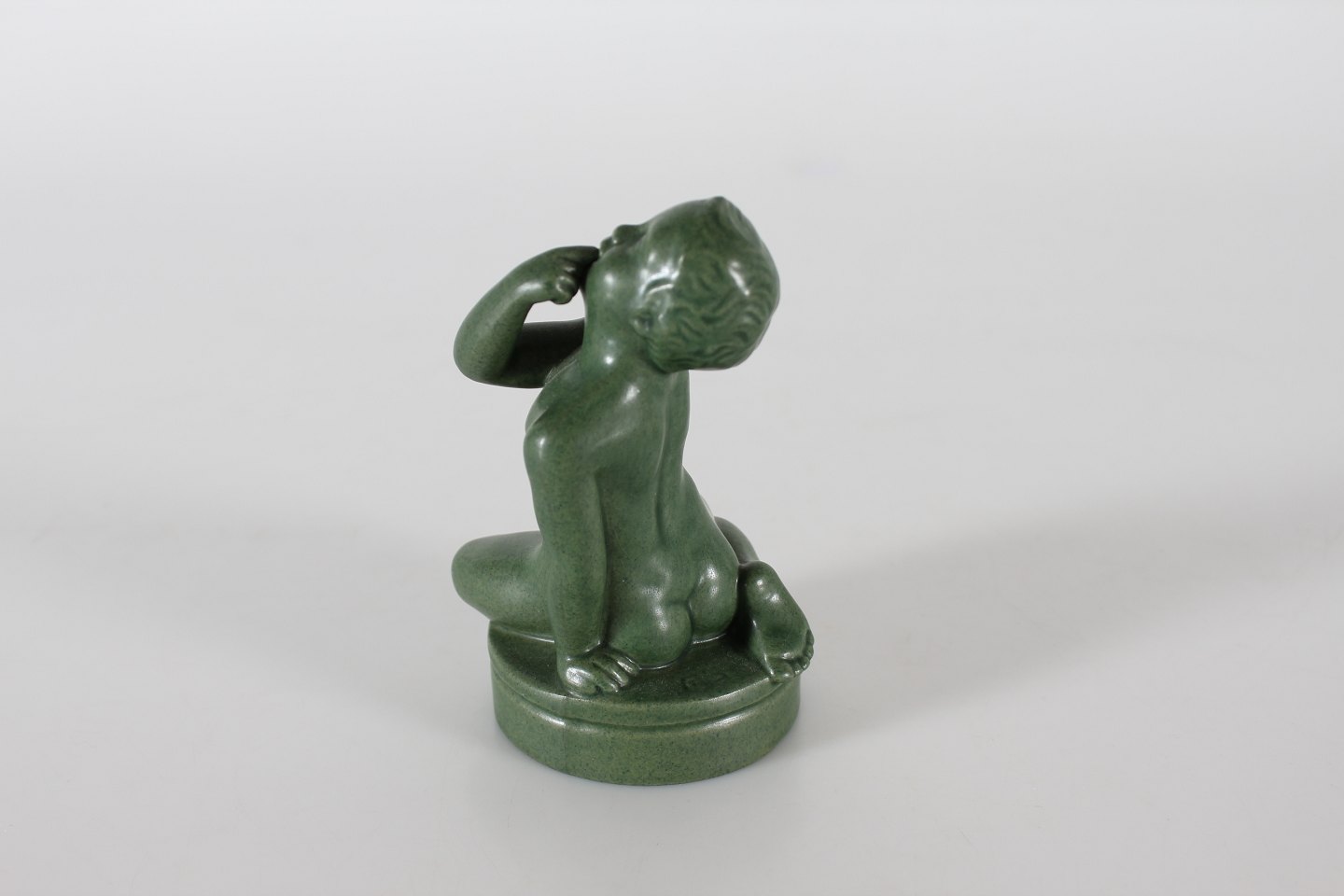 Ipsens Enke Figur nr. 862 af siddende dreng formgjort af Axel Sørensen Fremstillet af keramik dekoreret med jadegrøn glasur Sign: Ipsens Enke + 862 + Denmark Højde 12 cm Fin fejlfri stand