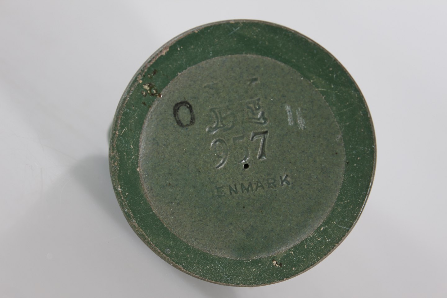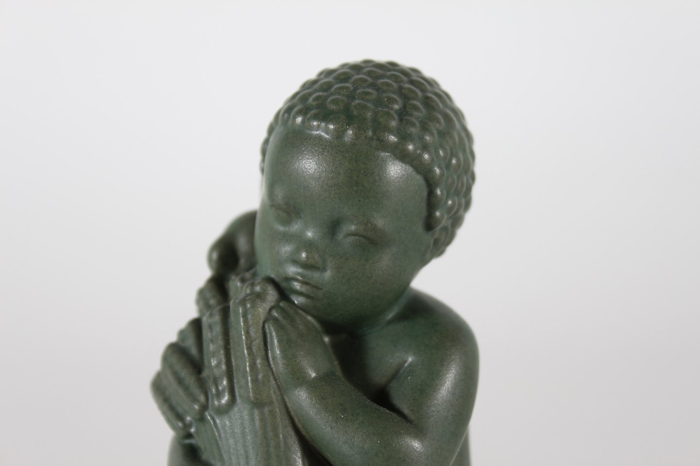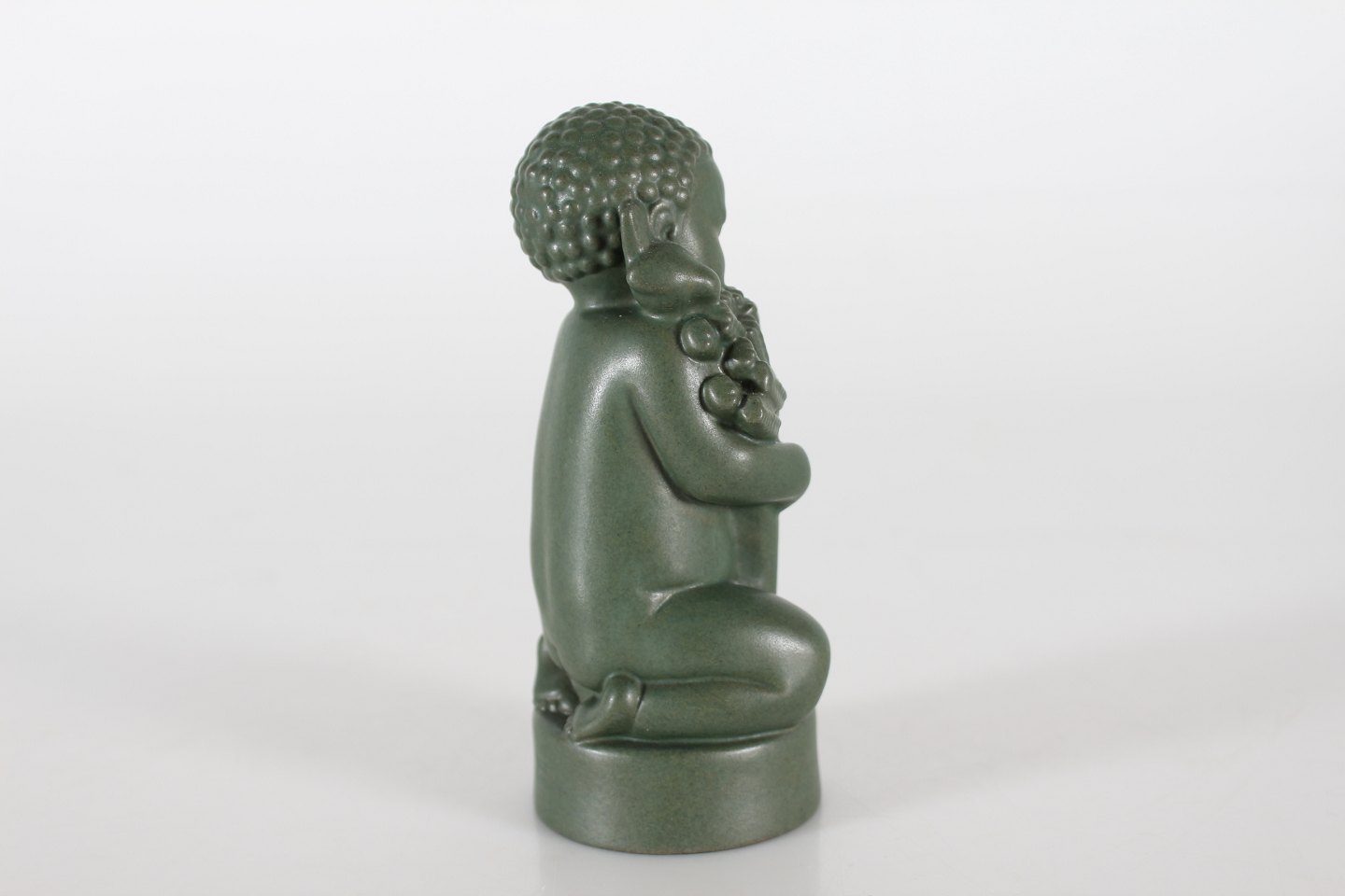 Ipsens Enke Figur nr. 957 (Vinter) dreng med kornneg tegnet af Arno Malinowski Fremstillet af keramik dekoret med jadegrøn glasur Sign: Ipsens Enke + 957 + Denmark Højde 13 cm Fin fejlfri stand