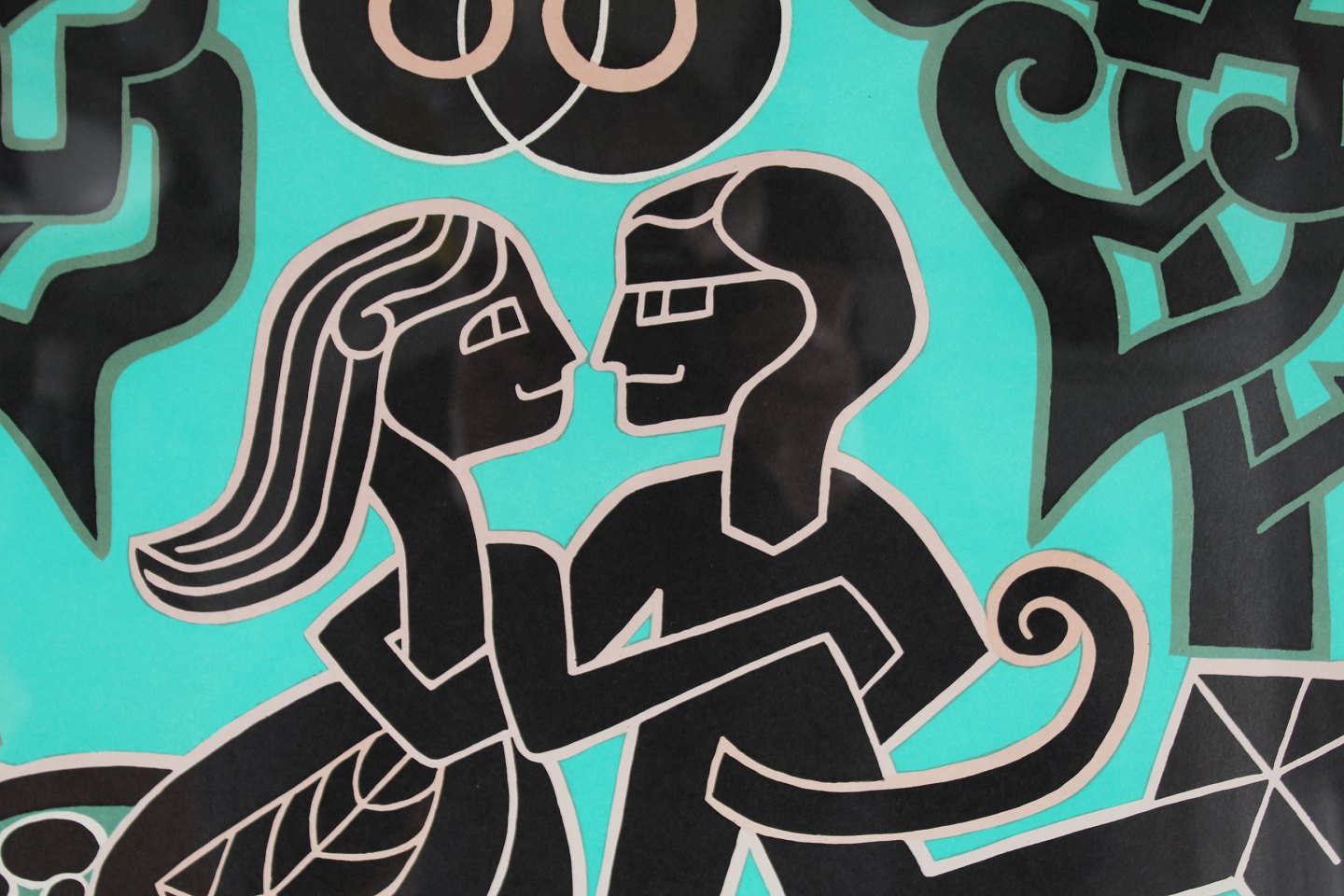 Henry Heerup (1907-1993) "Elskende par i Ornamentskoven" Litografi 94/200 Mål incl. passepartout og ramme 66 x 60 cm Sign. Heerup Indrammet i sølvramme i træ Fin stand Billedet kan beses efter aftale