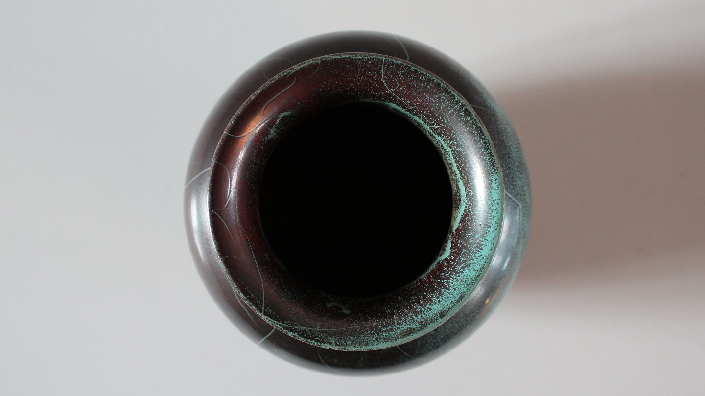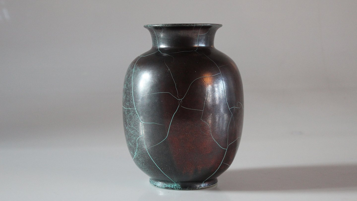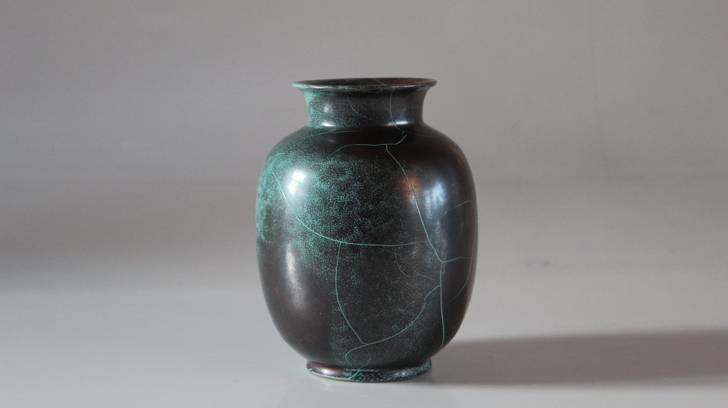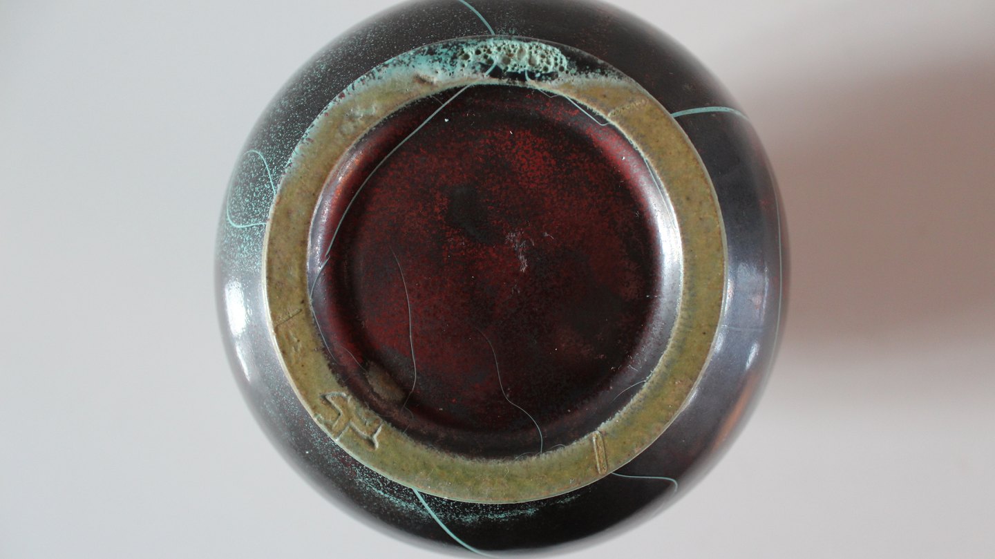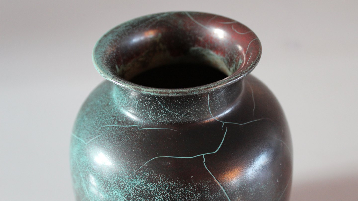 Richard Uhlemeyer (1900-1954) Keramik vase dekoreret med danit-glasur i rødbrune og turkise nuancer og krakele struktur Diameter 15 cm Højde 20,5 cm Fin stand uden skår eller reparation