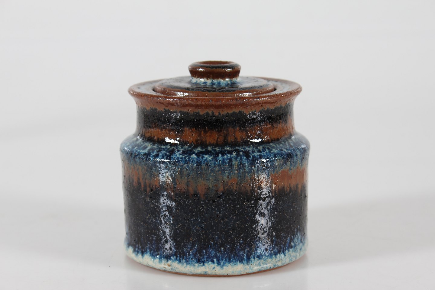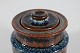 Gunver Bilde (1931-2018) Lågkrukke af stentøj i rustik stil dekoreret med blå-brune nuancer Sign. Bilde Højde 10 cm Diameter 11 cm Fin fejlfri stand