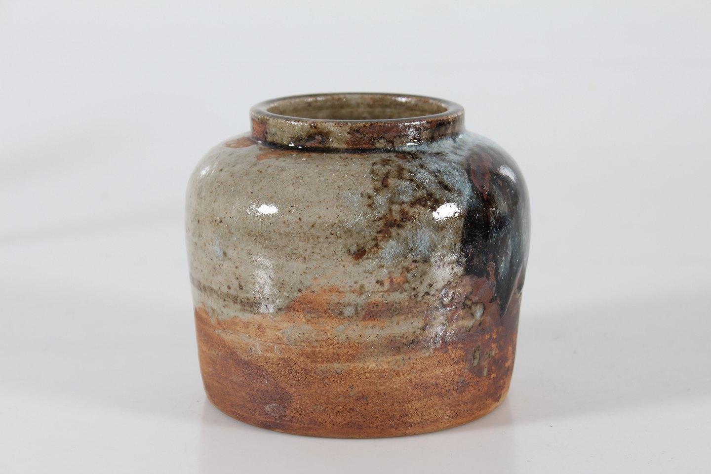 Conny Walther Bojanformet krukke af stentøj med abstrakt glasurdekoration Sign. monogram for Conny Walther fra hendes eget værksted Diameter 13 cm Højde 12,5 cm Fin stand uden skår eller rep.