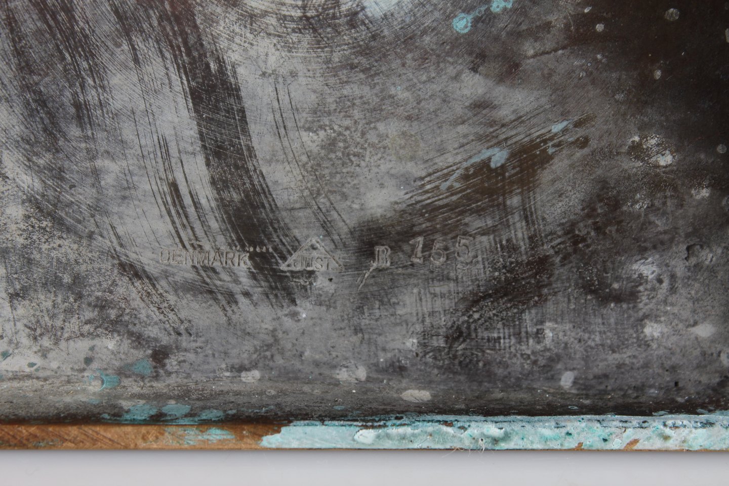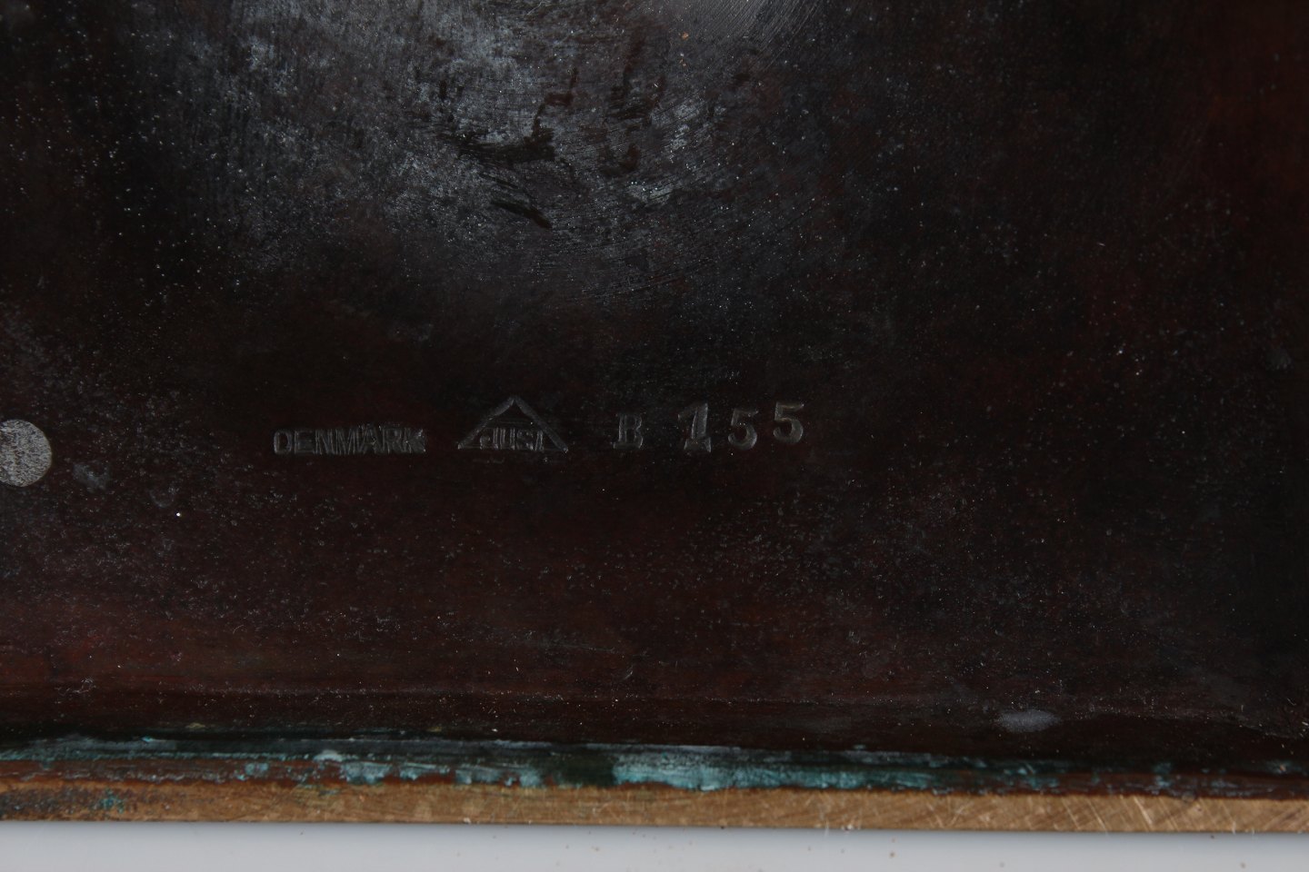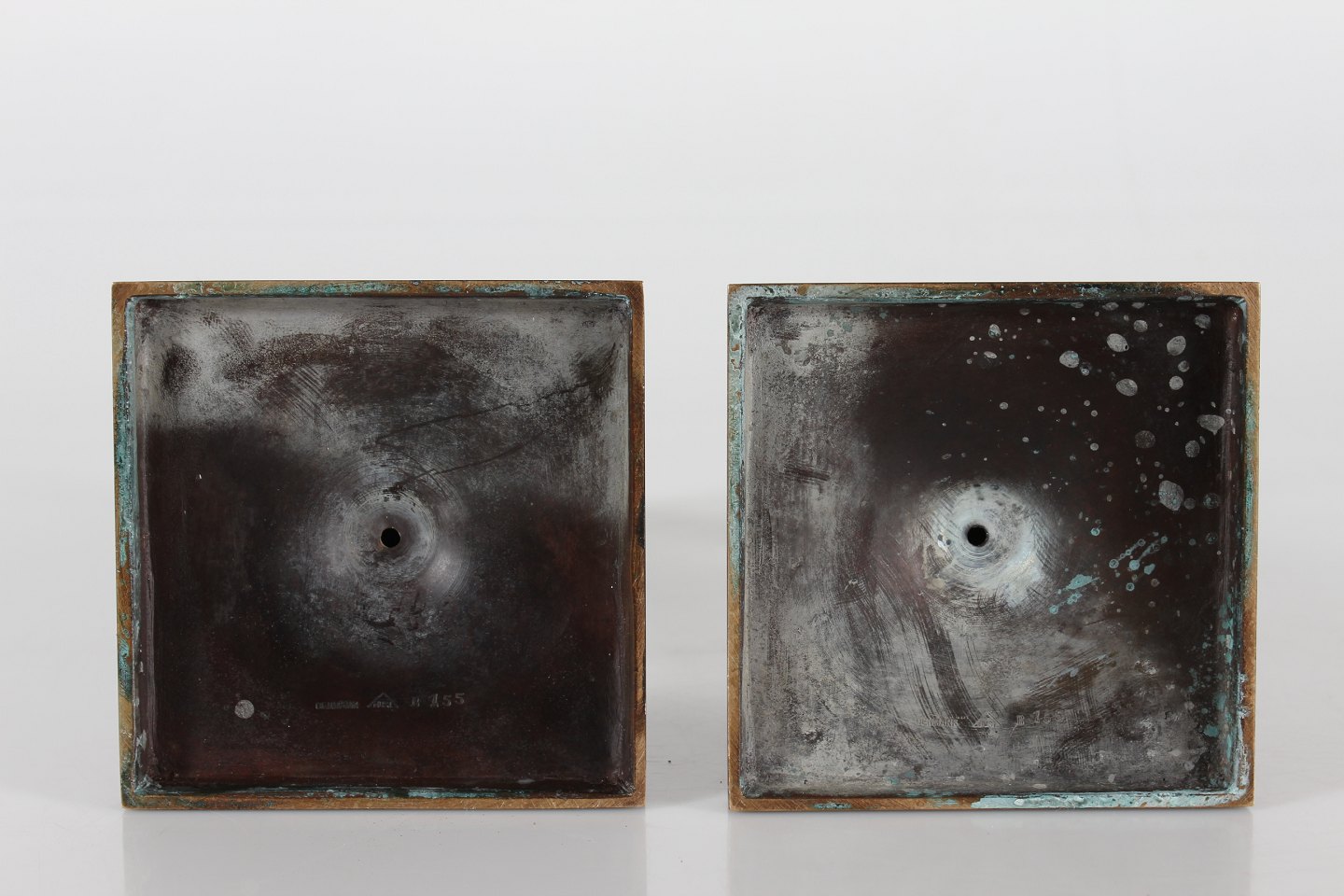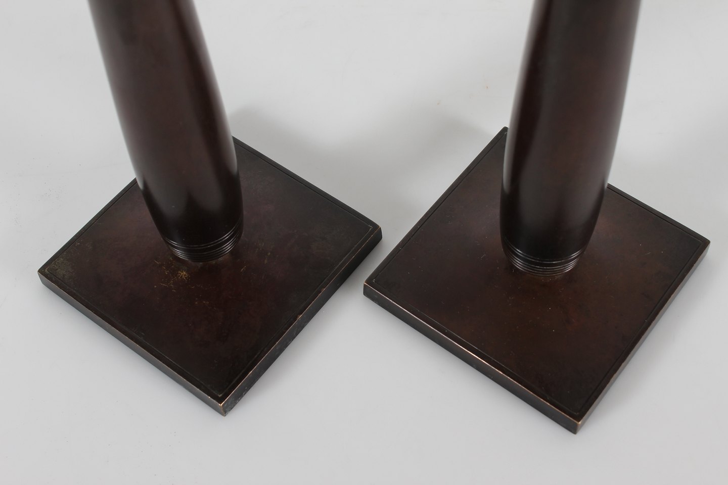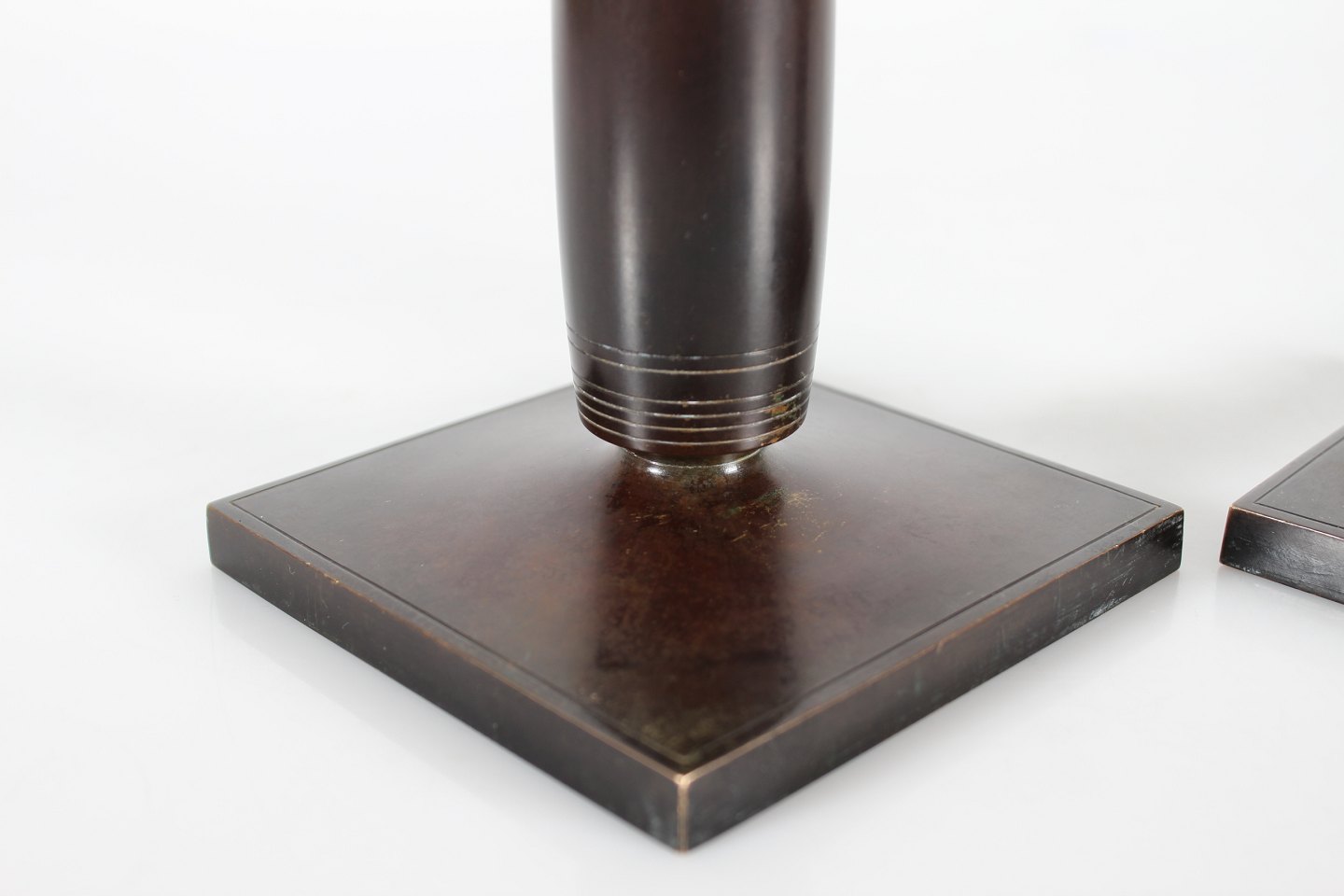 Just Andersen - Denmark Pair candlesticks made of bronze Model no. 155 Sign: Just A - Denmark + model B 155 Height 25 cm Length x width base: 11.5 x 11.5 cm Good vintage condition with beautiful brown patina