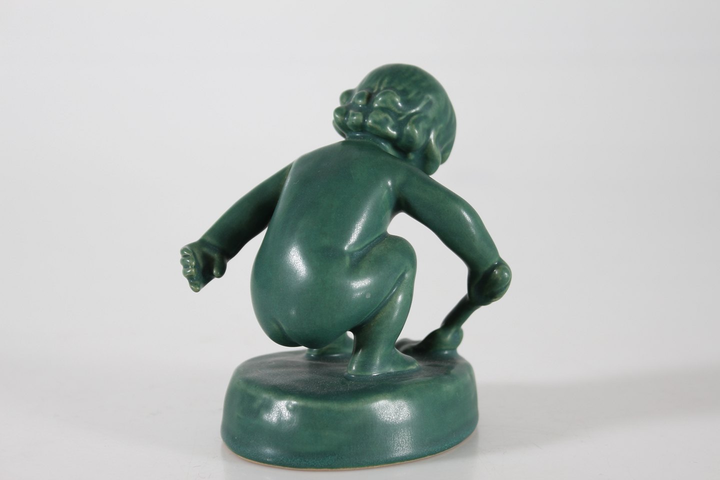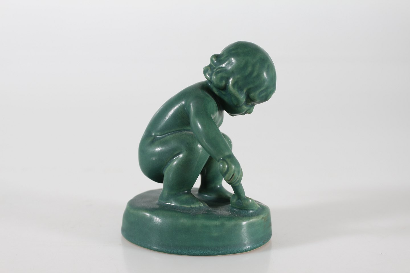 P. Ipsens Enke Figurine of a little girl with a shovel no. 889 designed by Adda Bonfils (1883-1943) Made of ceramic with jade green glaze Height 11 cm Width 8 cm Nice condition without chips