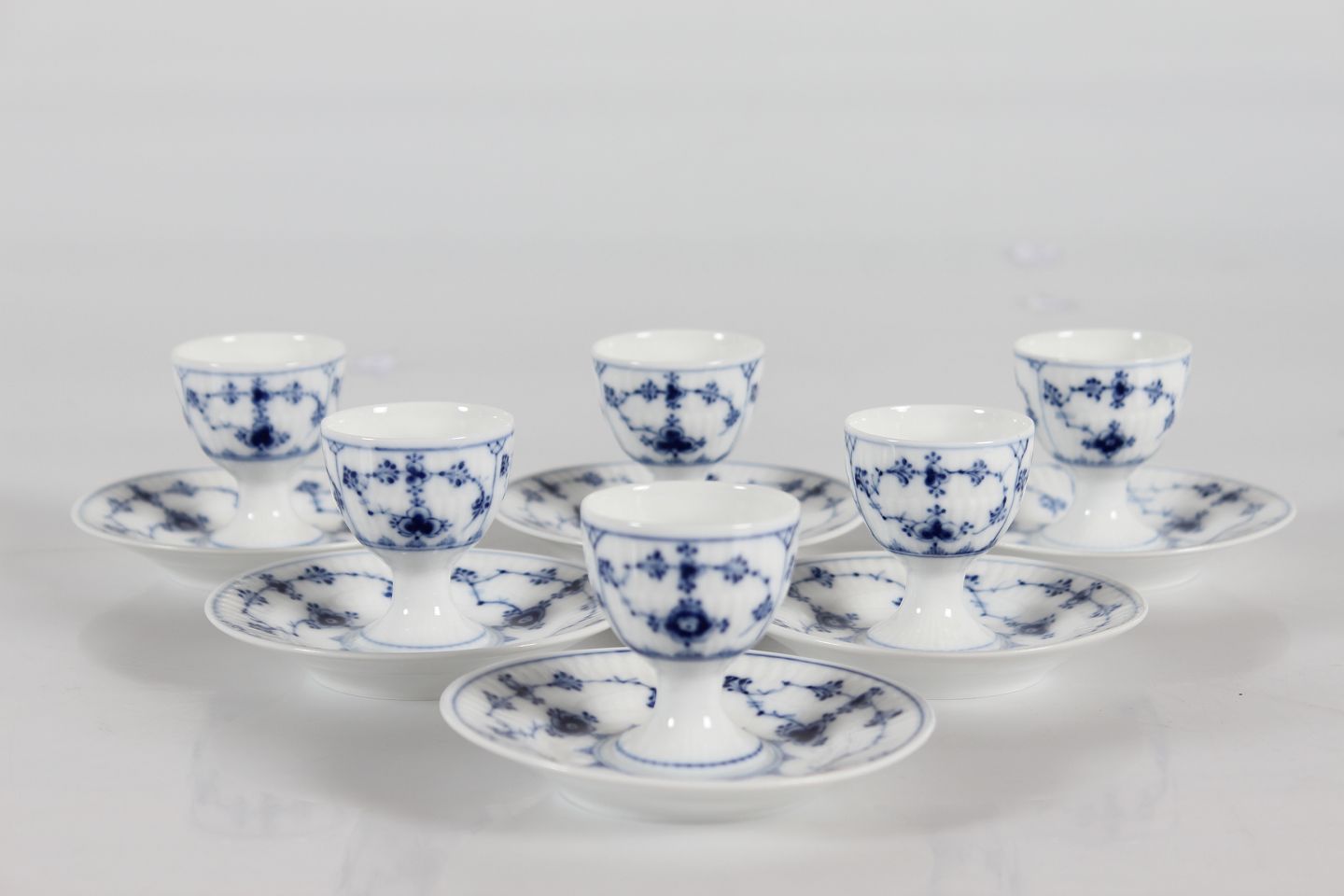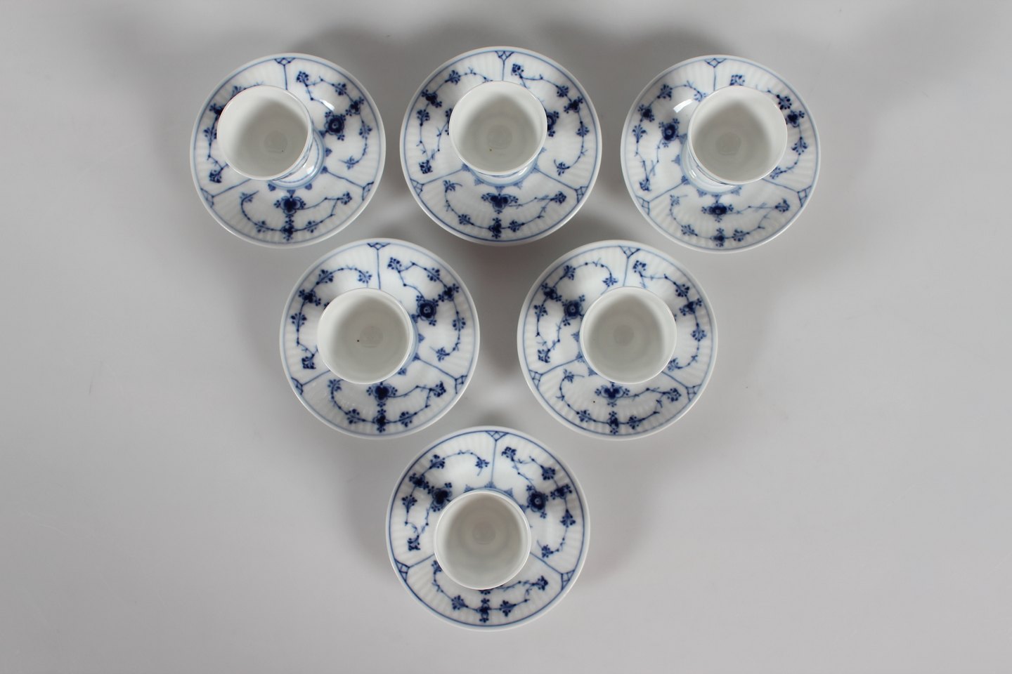 Royal Copenhagen Musselmalet Riflet Sæt på 6 sjældne æggebægere m/fasttilknyttet undertallerken nr. 1/117 Med stempel fra perioden 1893-1900 Diameter 10,5 cm Højde 6 cm 1. sortering Fin fejlfri stand uden skår eller revner