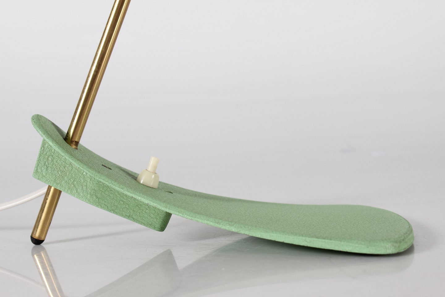 Italiensk bordlampe UFO Fremstillet i metal og messing med støvet grøn lak Tilskrevet den Italienske producent Stilnovo Højde 32 cm Længde 40 cm Diameter skærm 35 cm Fin funktionsdygtig stand