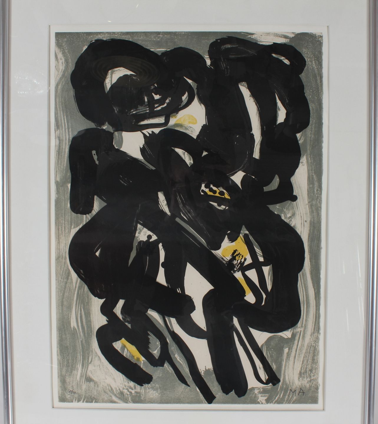 Mogens Andersen (1916-2003) Abstrakt komposition, farvelitografi 50/90 i sølvfarvet træramme Sign. MA Højde 99/76,5 cm Bredde 78/56.5 cm Fin stand Billedet kan beses efter aftale
