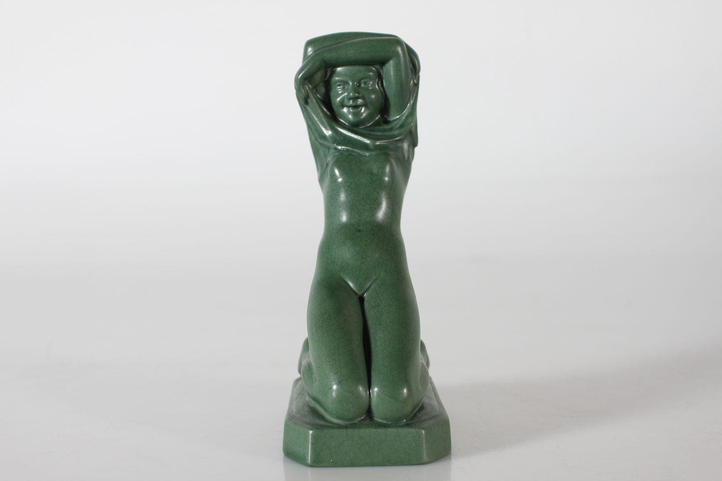 P. Ipsens Enke Figur "Før Badet" knælende pige nr. 861 Formgjort af Axel Sørensen Fremstillet af keramik m/Jadegrøn glasur Højde 15,5 cm Fin stand