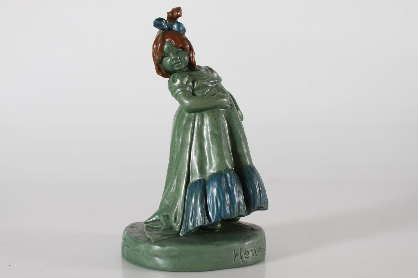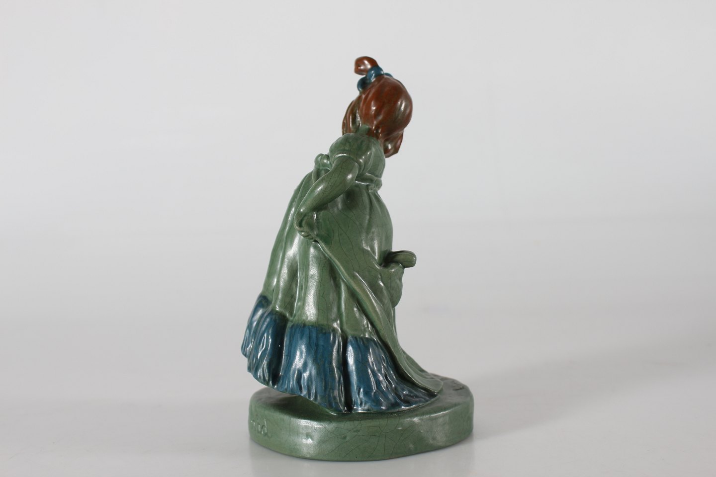 Ipsens Enke Figur "Hennes nåd" nr. 891 formgjort af Lena Börjeson (1879-1976) Fremstillet af keramik dekoreret med jadegrøn glasur samt lidt rødt og blåt Højde 18,5 cm Fin stand med enkelt chip på sløjfen