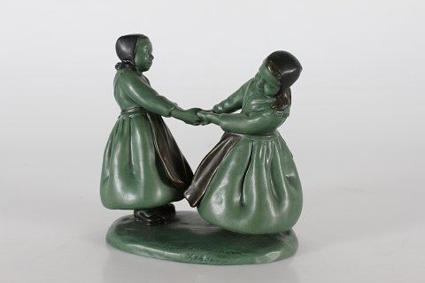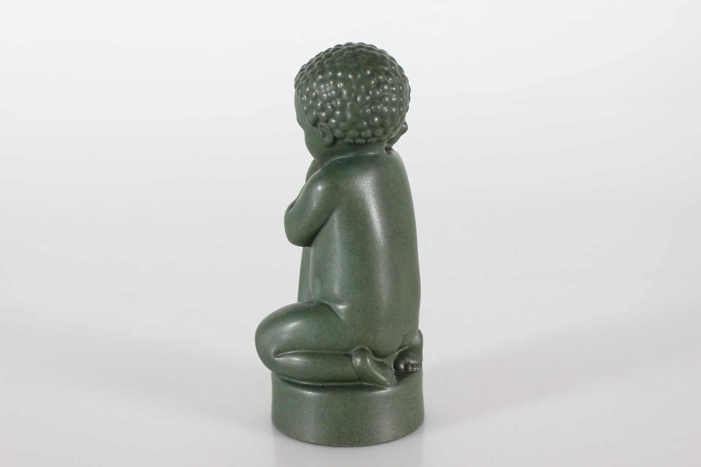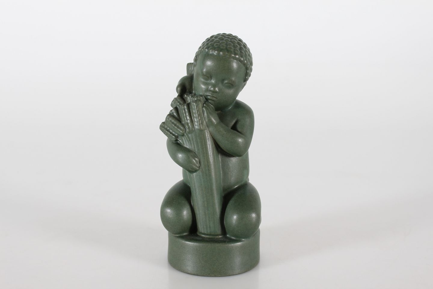 Ipsens Enke Figur nr. 957 (Vinter) dreng med kornneg tegnet af Arno Malinowski Fremstillet af keramik dekoret med jadegrøn glasur Sign: Ipsens Enke + 957 + Denmark Højde 13 cm Fin fejlfri stand