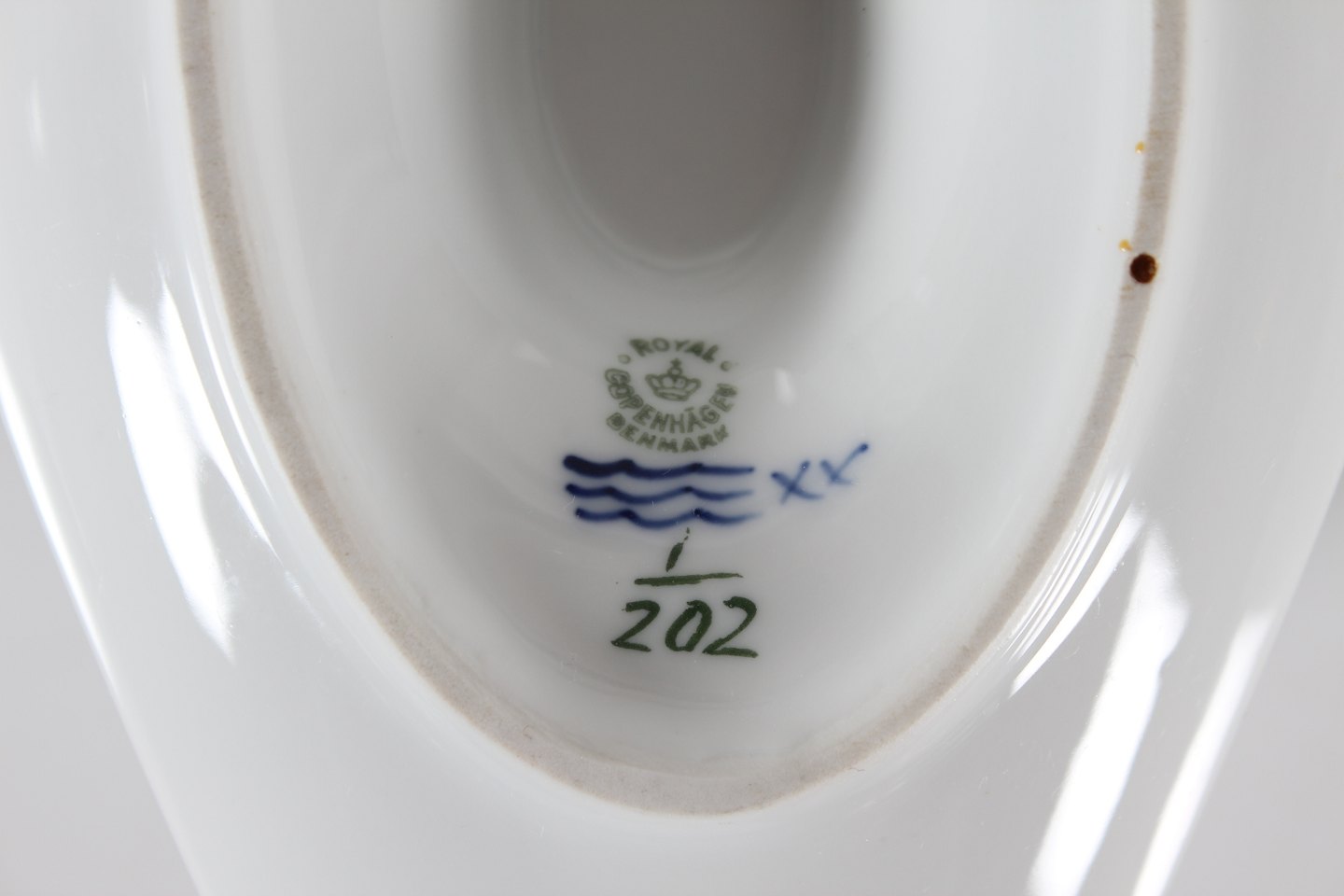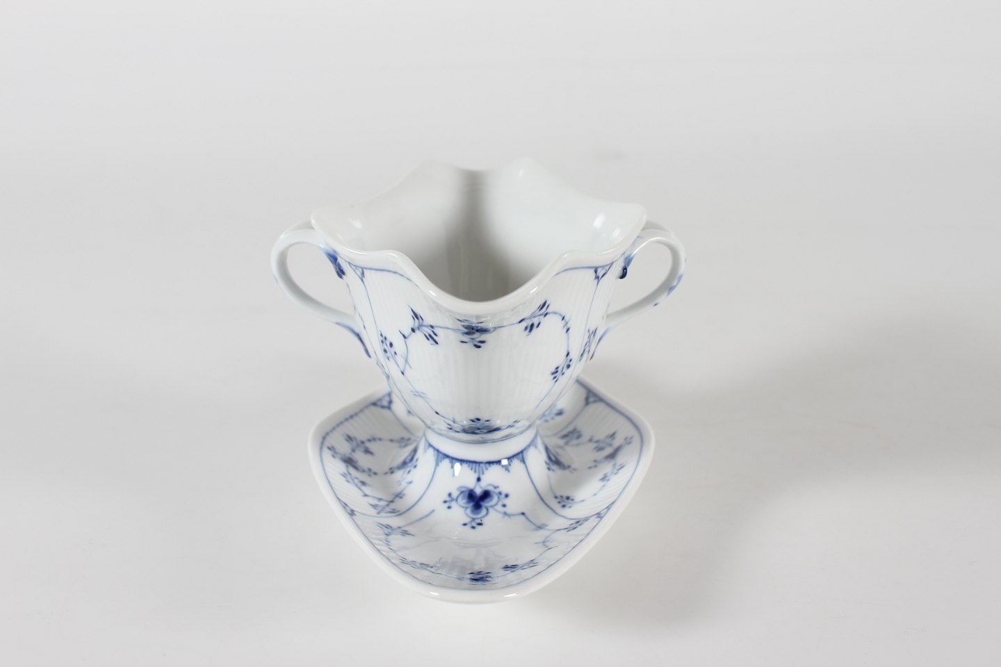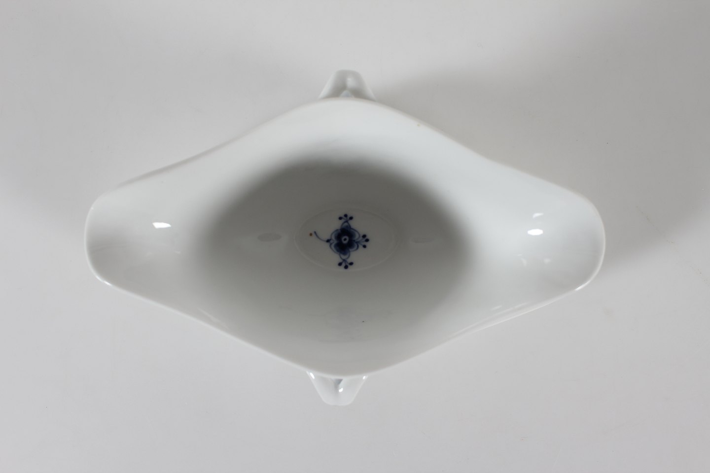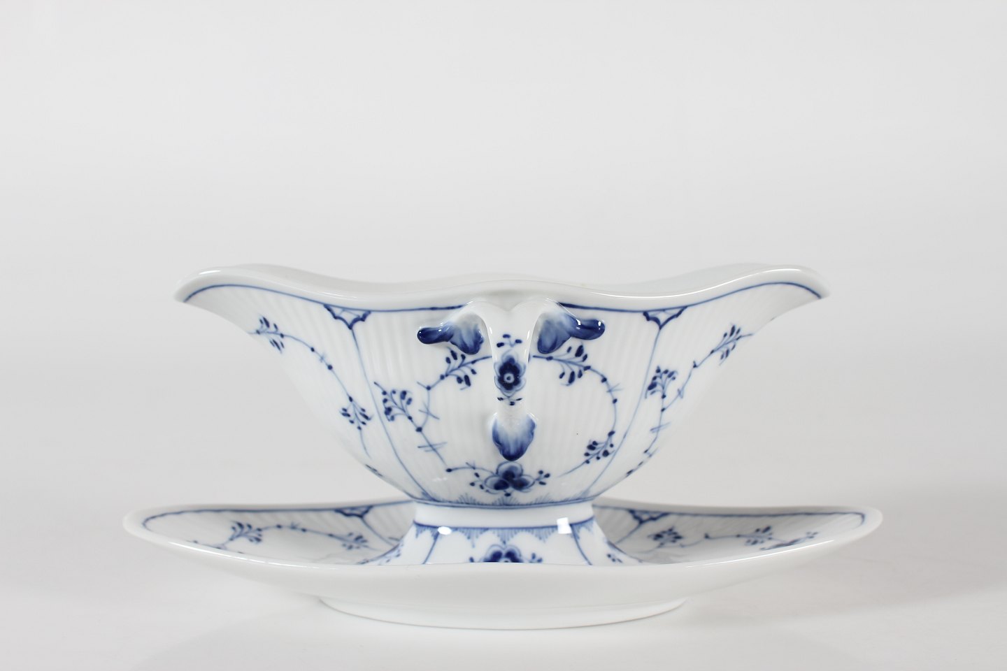 Royal Copenhagen musselmalet riflet Sauceskål med øre og på fast underfad nr. 1/202 Med stempel fra 1946 Længde 24,5 cm - højde 10,5 cm Fin fejlfri 1. sortering