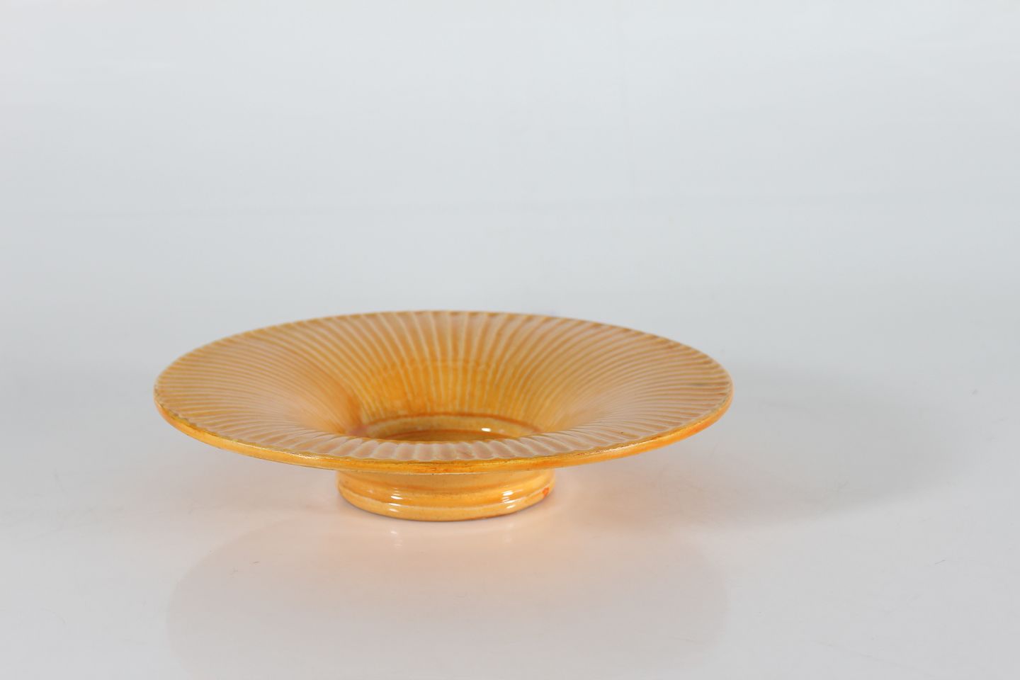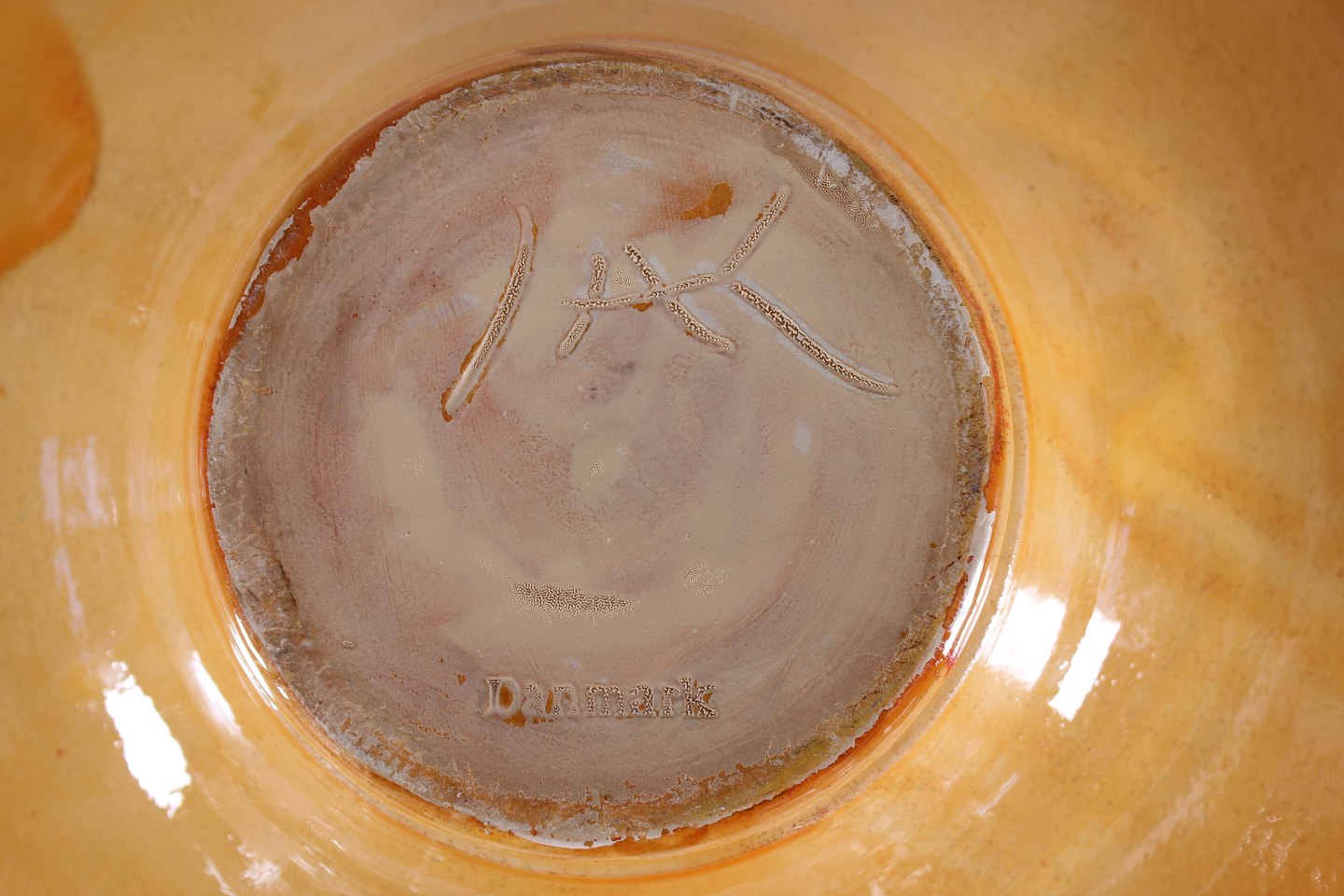 Herman A. Kähler Svend Hammershøi præstekravefad dekoreret med gul uranglasur cirka 1930'erne Sign. HAK + Danmark Højde 6 cm Diameter 30 cm Fin stand uden skår og revner