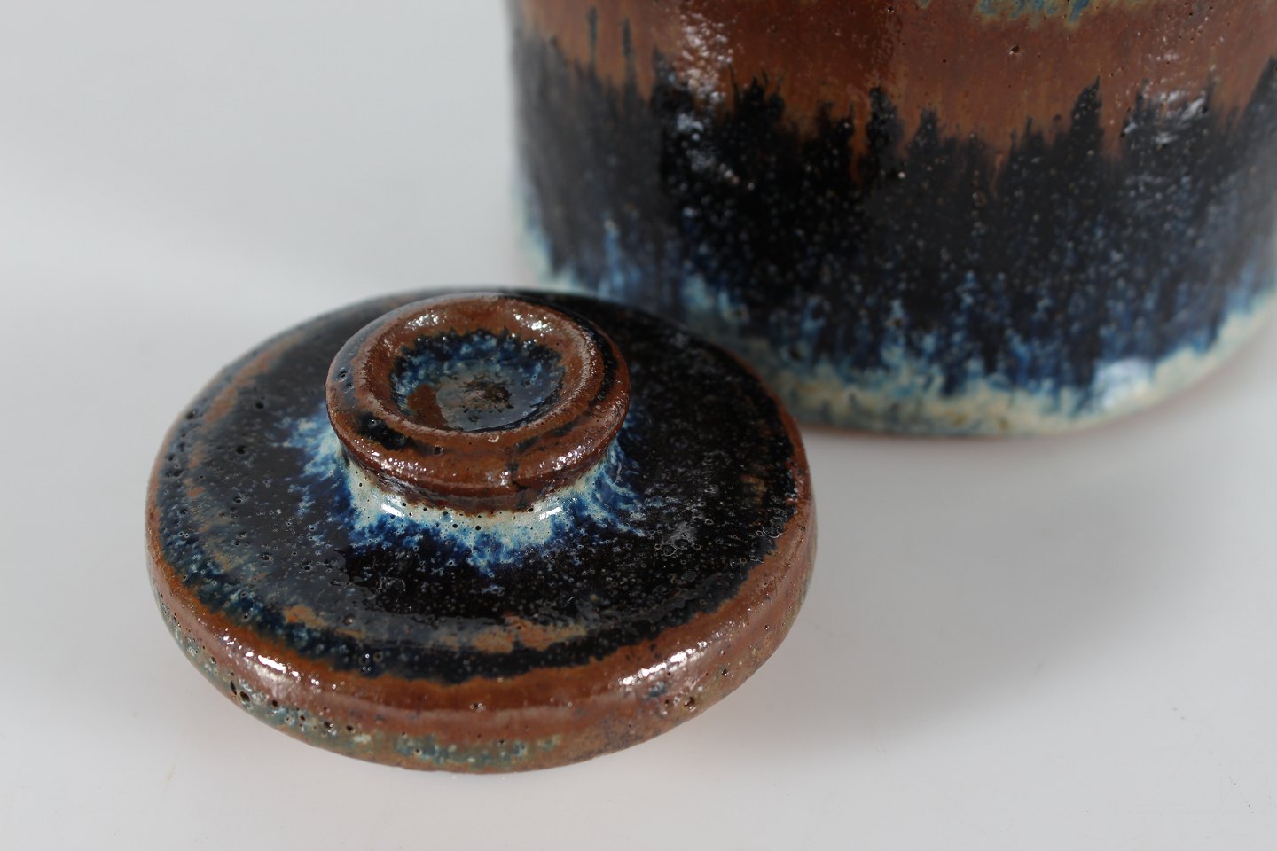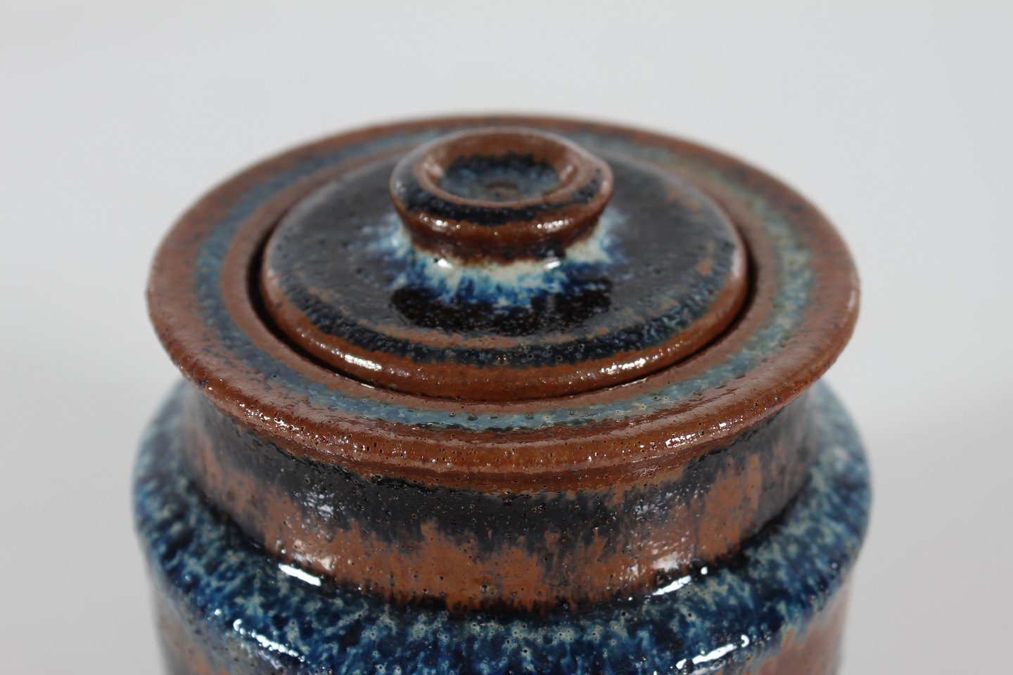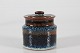 Gunver Bilde (1931-2018) Lågkrukke af stentøj i rustik stil dekoreret med blå-brune nuancer Sign. Bilde Højde 10 cm Diameter 11 cm Fin fejlfri stand