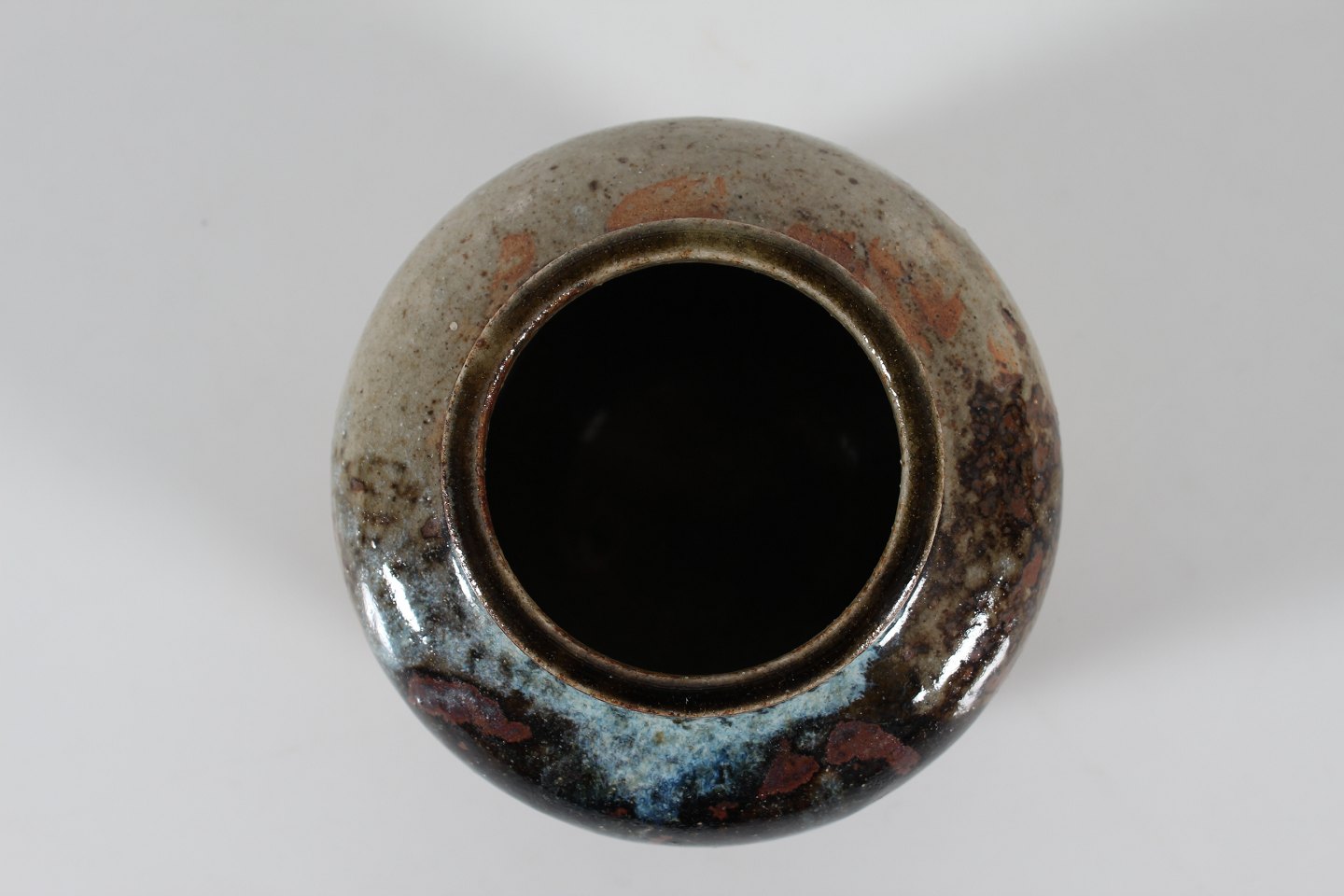 Conny Walther Bojanformet krukke af stentøj med abstrakt glasurdekoration Sign. monogram for Conny Walther fra hendes eget værksted Diameter 13 cm Højde 12,5 cm Fin stand uden skår eller rep.